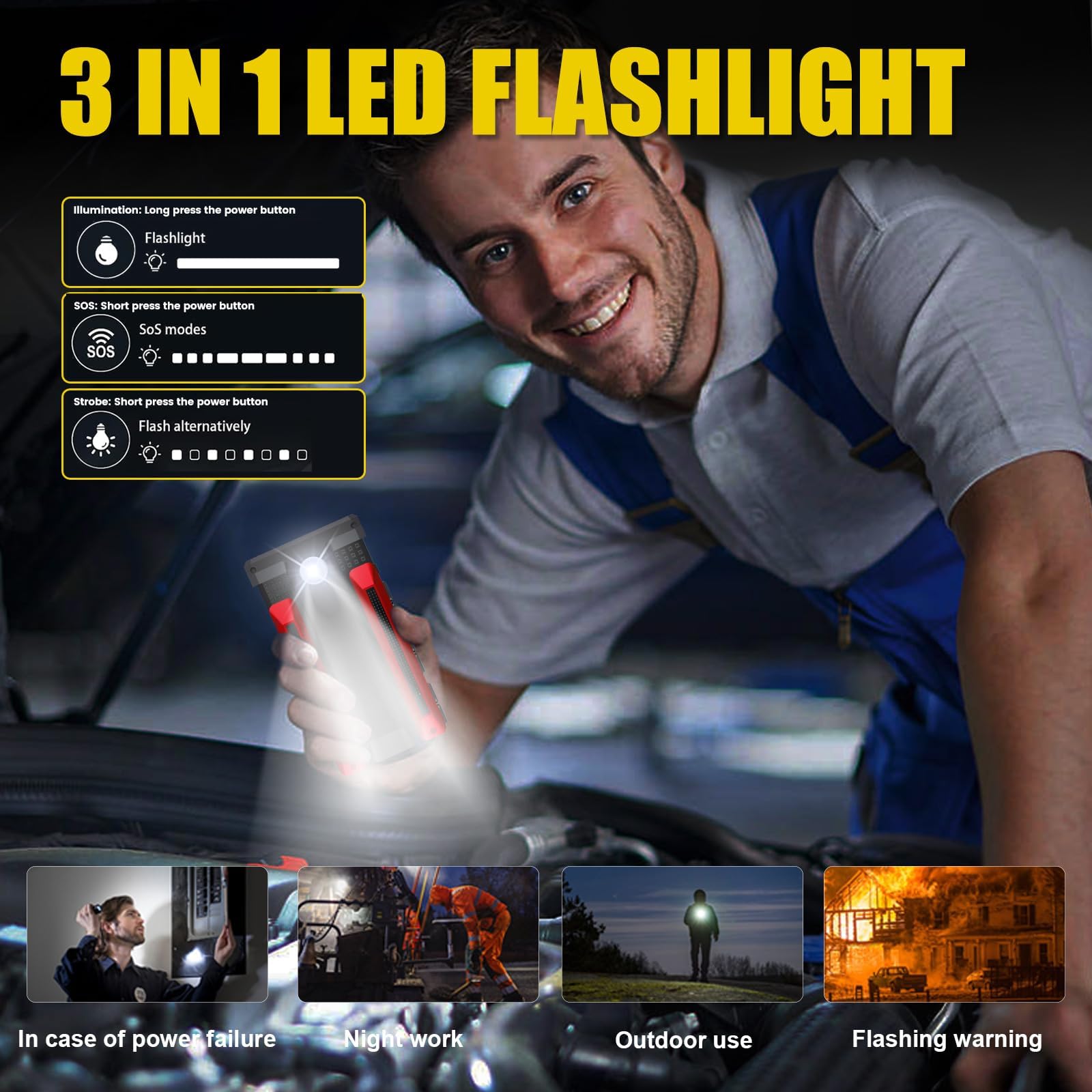 【More Than a Jump Box】In addition to its jump-starting capabilities, this portable jump starter also features three flashlight illumination modes - normal, strobe, and SOS - providing emergency lighting in different scenarios. Not only does this jump starter come to the rescue when your car battery is dead, but it also doubles as a power bank. The USB port allows you to charge your mobile devices, ensuring that you stay connected even in remote locations. Compact and lightweight, the Scatach 002 Car Jump Starter is the perfect companion for any road trip or emergency situation. Don't leave home without it!