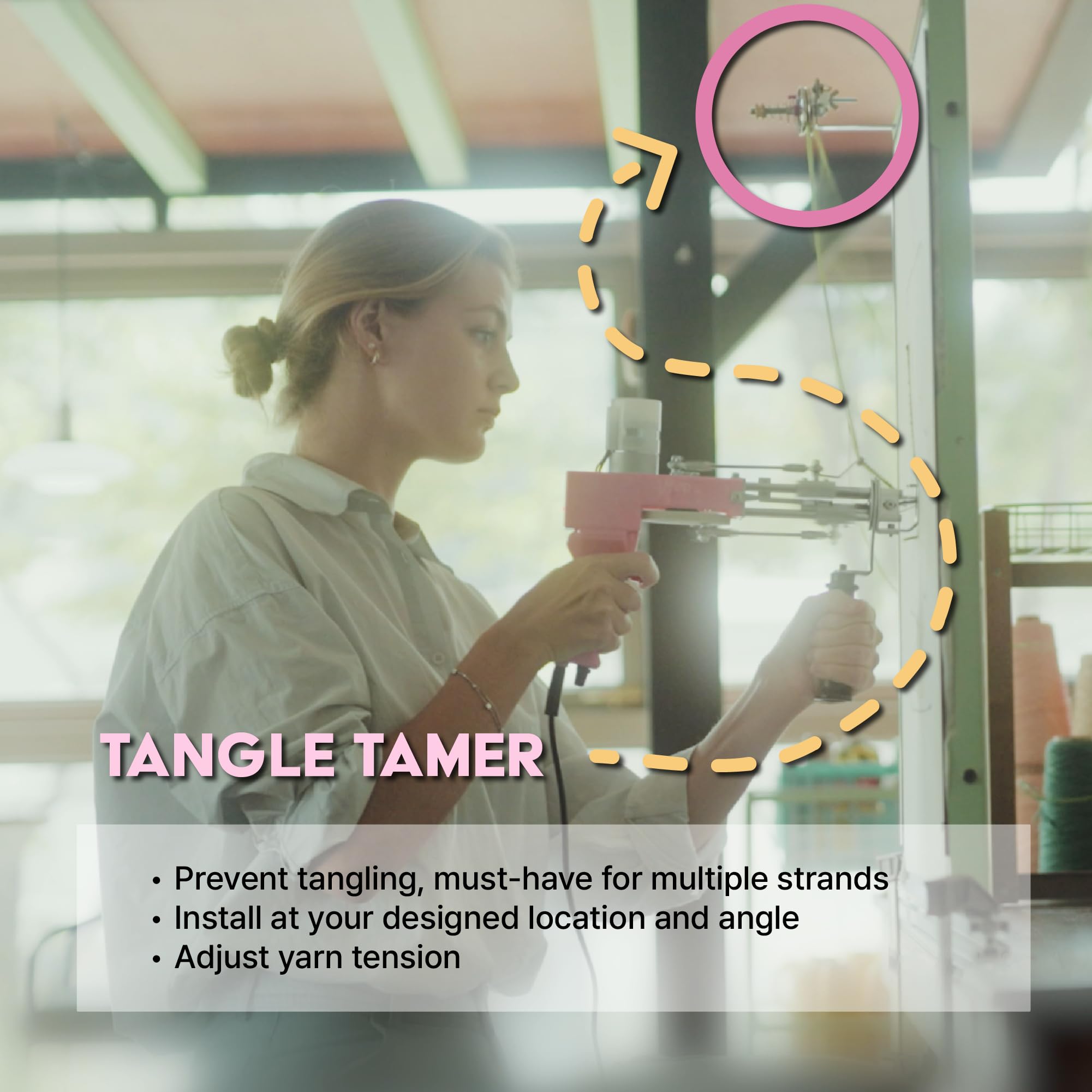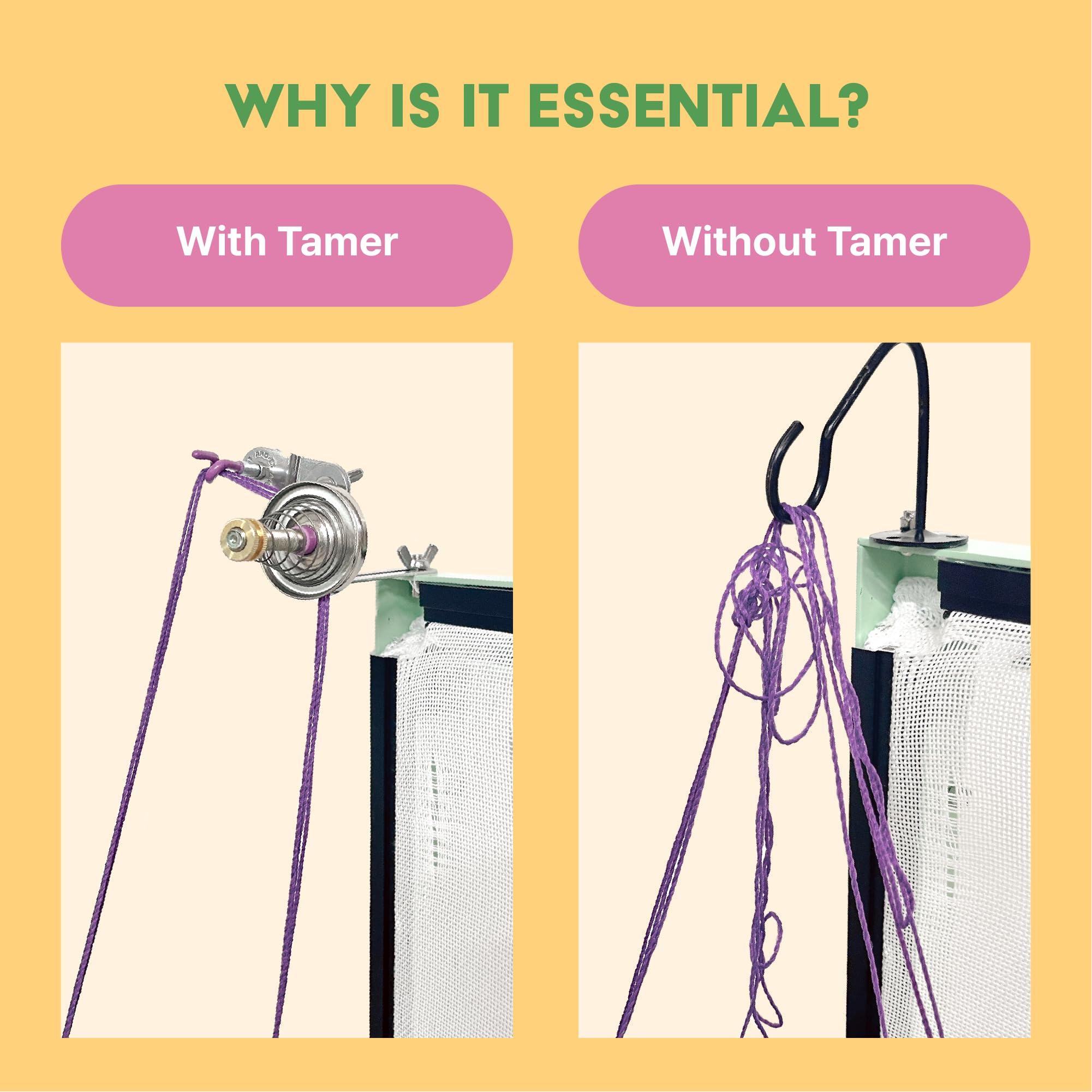 Free Yourself from Yarn Tangling : When working with yarn at a rapid pace, such as in tufting, yarn tangles can be a major inconvenience. Tangle Tamer is a compact yet powerful tool that helps ensure smooth and fast yarn supply. Say goodbye to the frustration of tangling yarn strands when working with multiple threads.