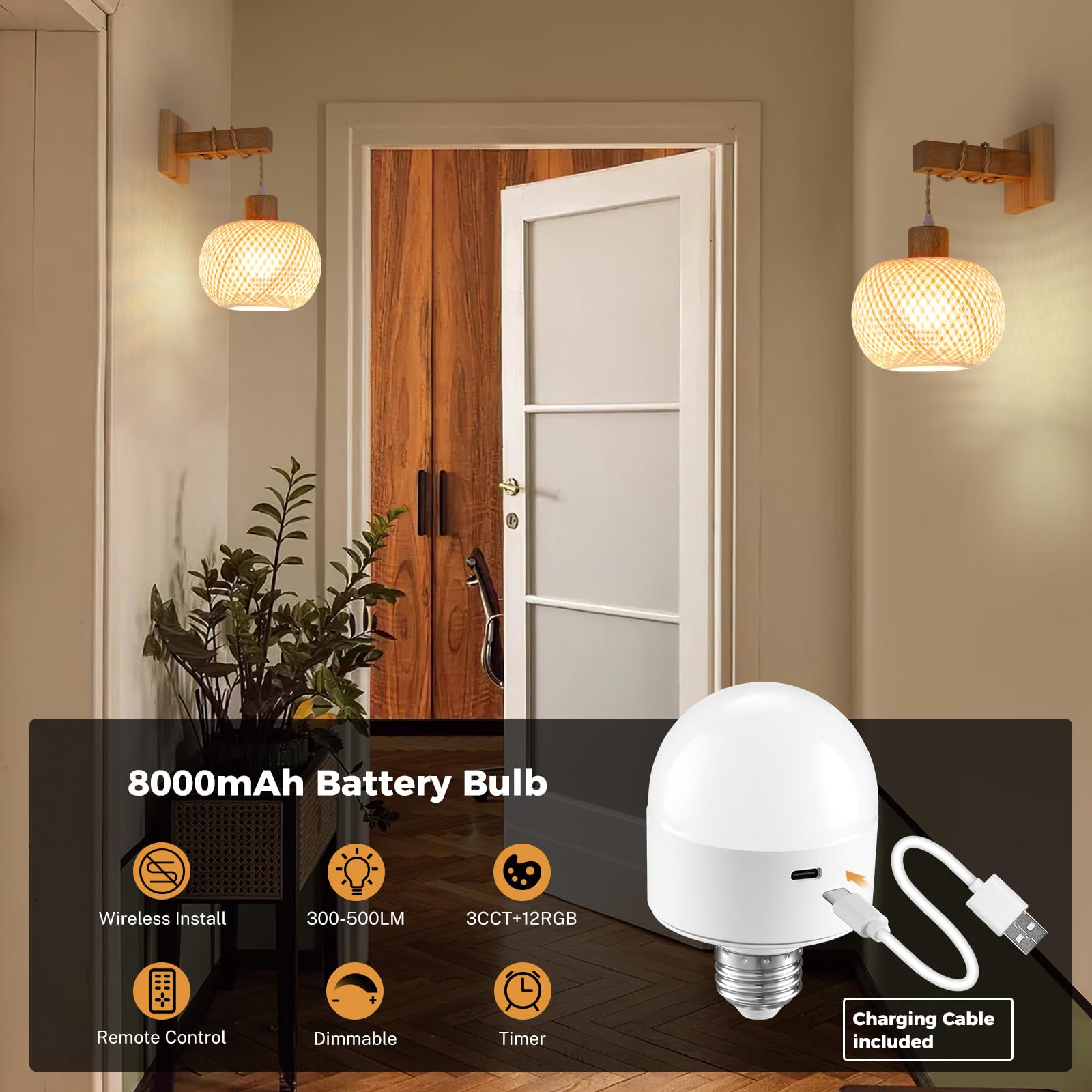 Package Included & Warranty - Glitnous indoor cordless boho bamboo battery powered wall sconce set comes with 2 wall lamps, 2 rechargeable LED bulbs, 2 remote controls, 2 USB charging cable (Type-C), mounting screws. If you have any questions before or after purchase, please feel free to contact us.
