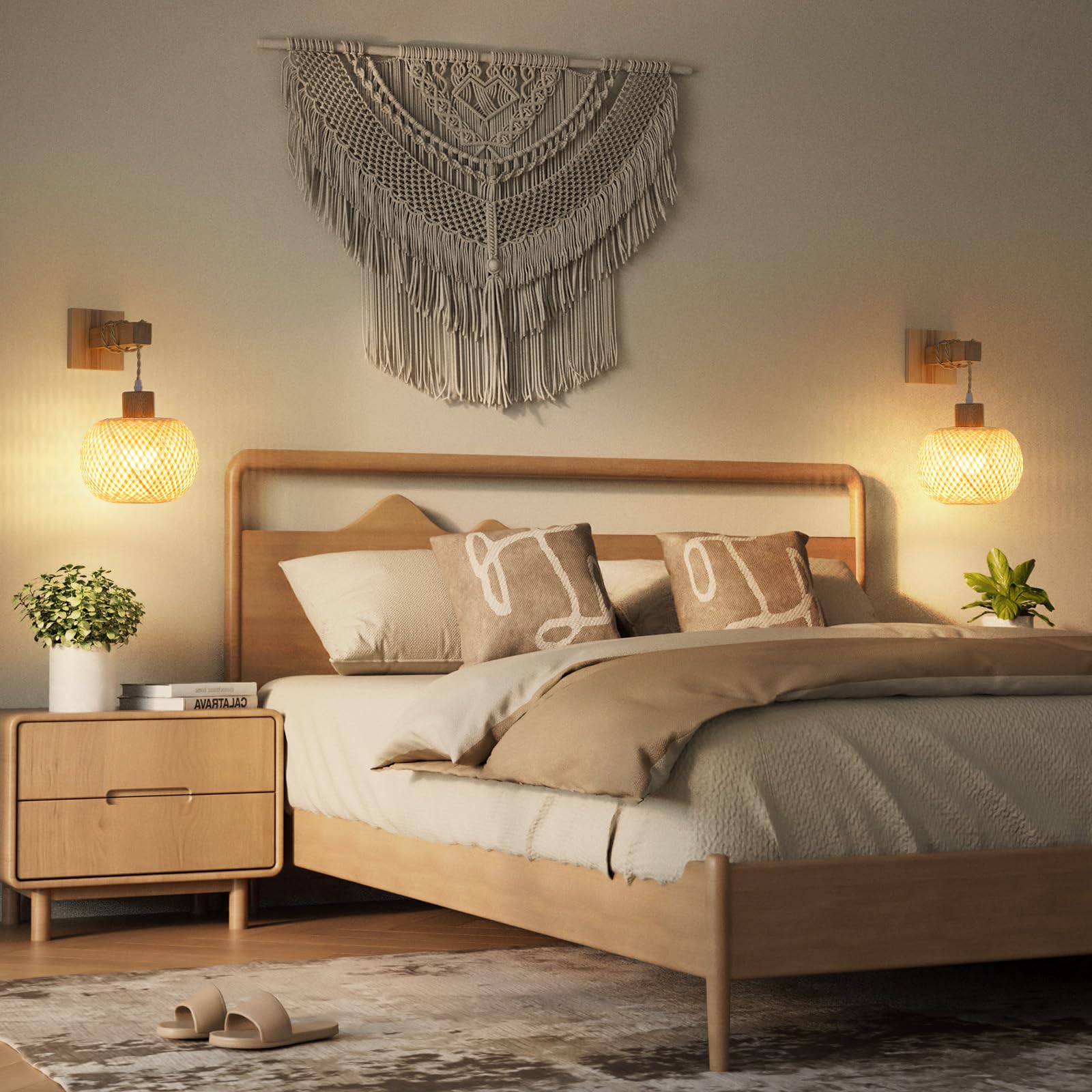 Set of 2 Natural Bamboo Rattan Sconces - Battery operated wall sconce handmade bamboo woven lanterns are ideal bedroom decor lamp, which can create 360° shadow light effect, provide a cozy nighttime atmosphere for you to feel relaxed. The boho wall sconces also suitable for other dark areas where is no power supply. (--The lantern cage size: Diameter 7.87", High 5.9". The lanterns woven with natural bamboo will have a slight color difference. )
