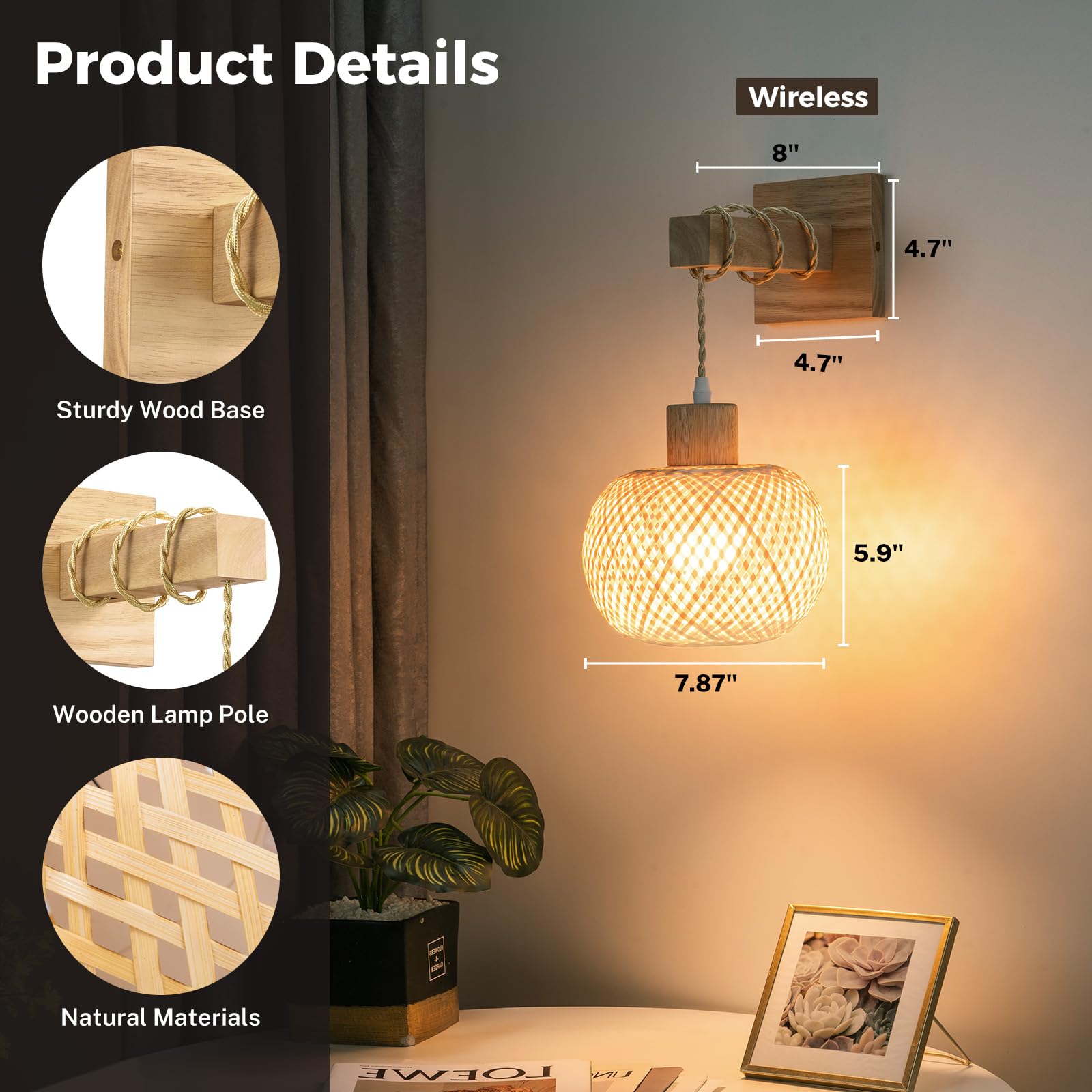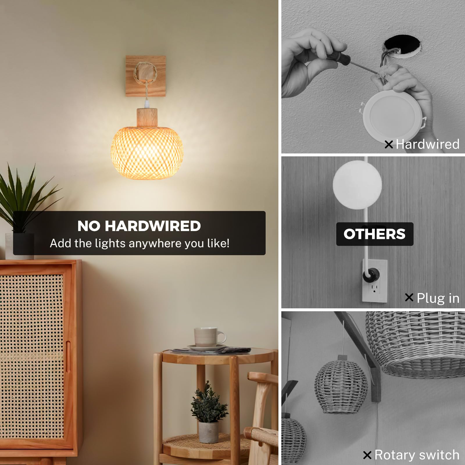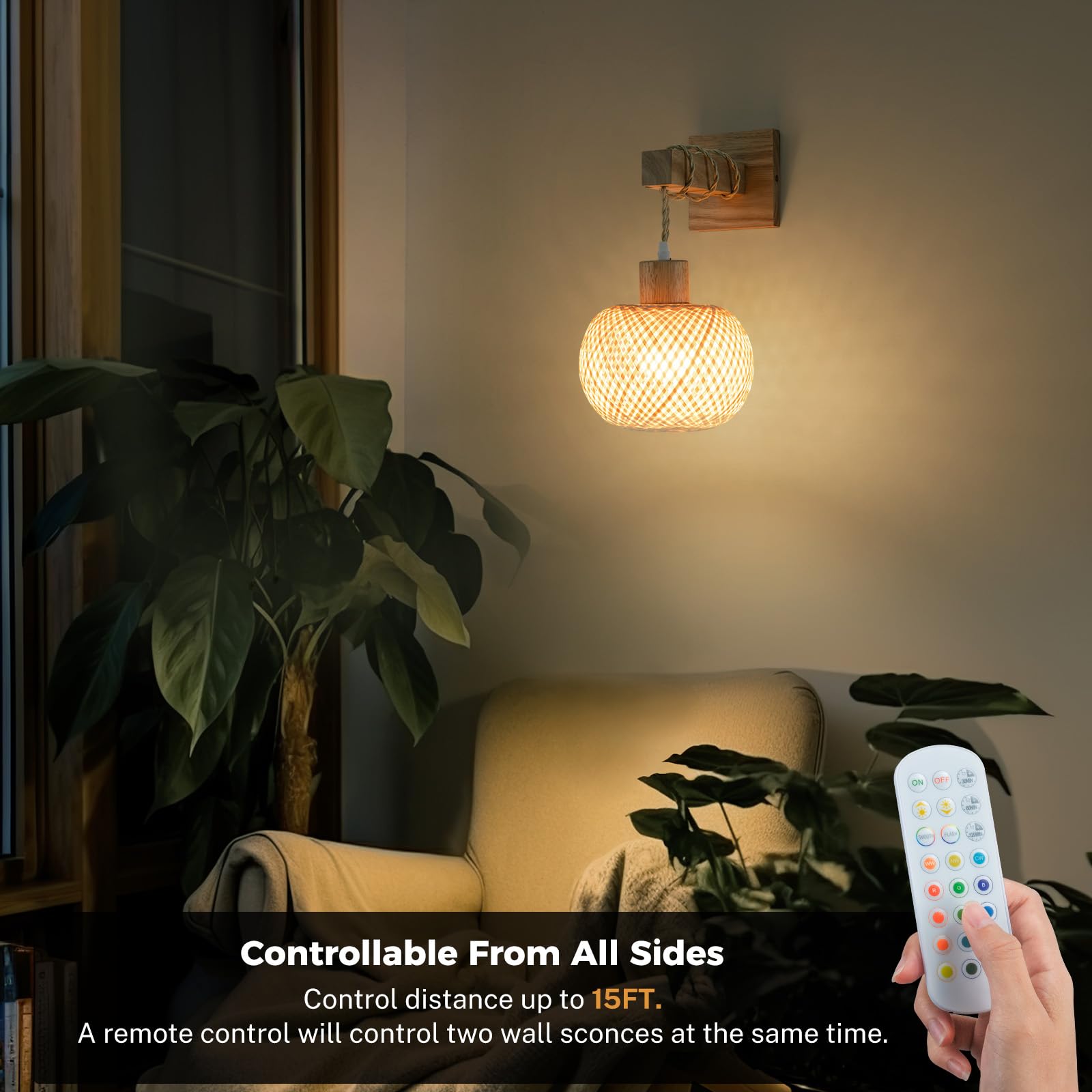 Easy Install - Add cordless wall lights without needing an electrician! No hardwired mounting, the bamboo battery wall sconces set of two only takes a few minutes to install. The battery sconces set of 2 helps you easily add light to any space and brings the room tropical breeze with boho chic in your home. These wall sconces battery operated can provide light even when power outages. (Please keep the lanterns in a dry environment)