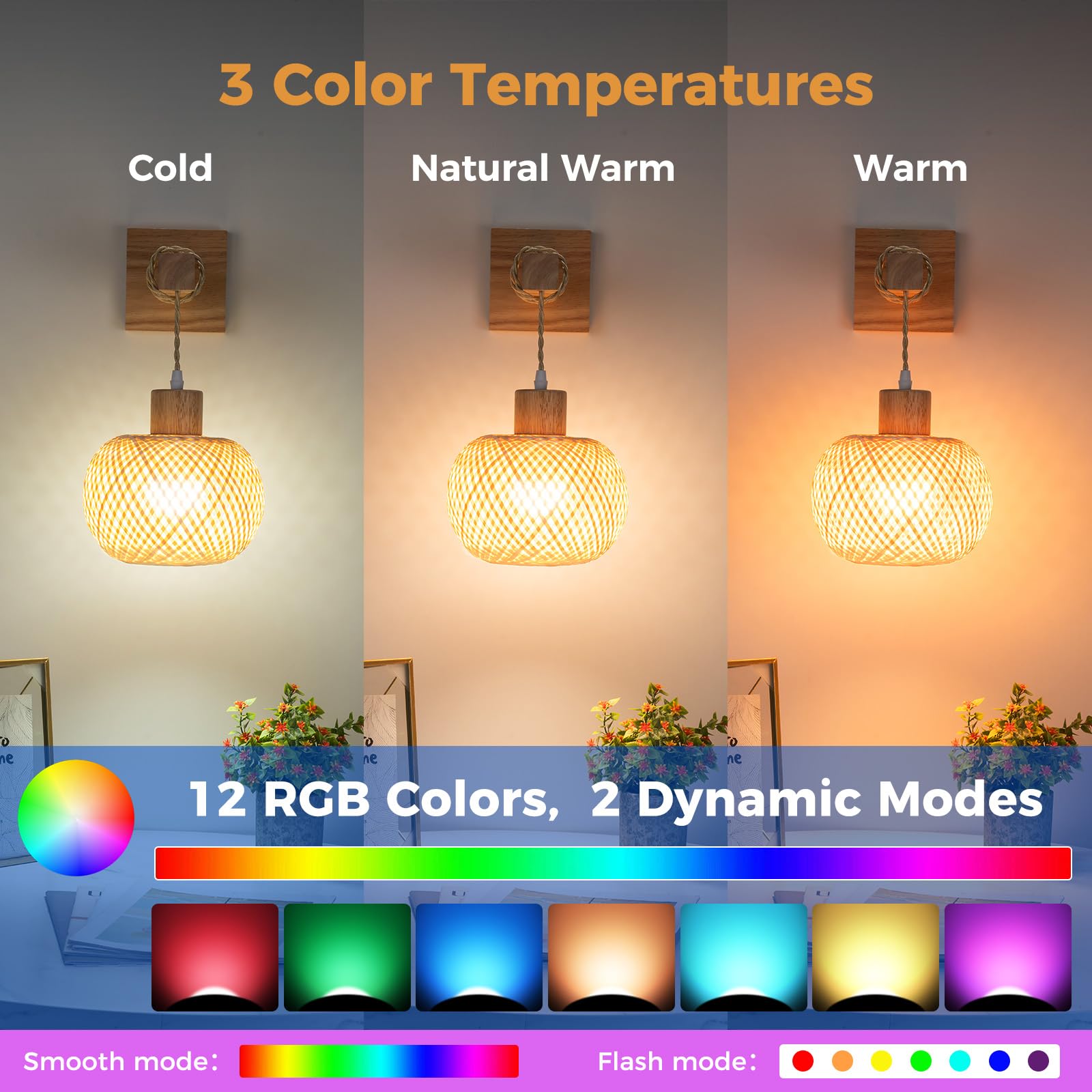 3 Color Temperatures & 12 RGB Colors - The rechargeable wall sconce has 3 color temperatures: 3000K Warm, 4500K Natural Warm, and 6000K Cold White. The wall sconces set of two battery operated with additional 12 RGB colors and 2 dynamic ambience light modes will bring you more joy and surprises.