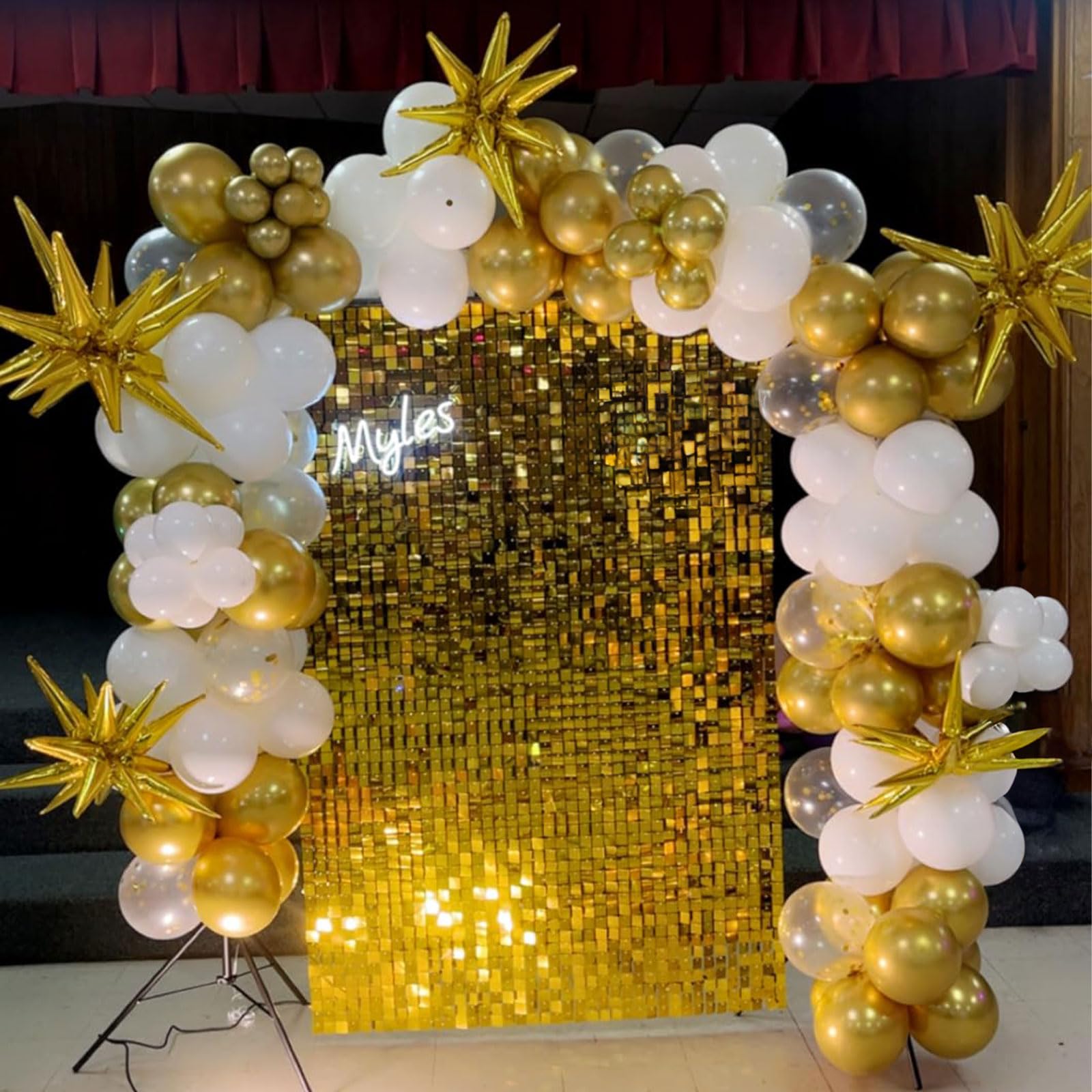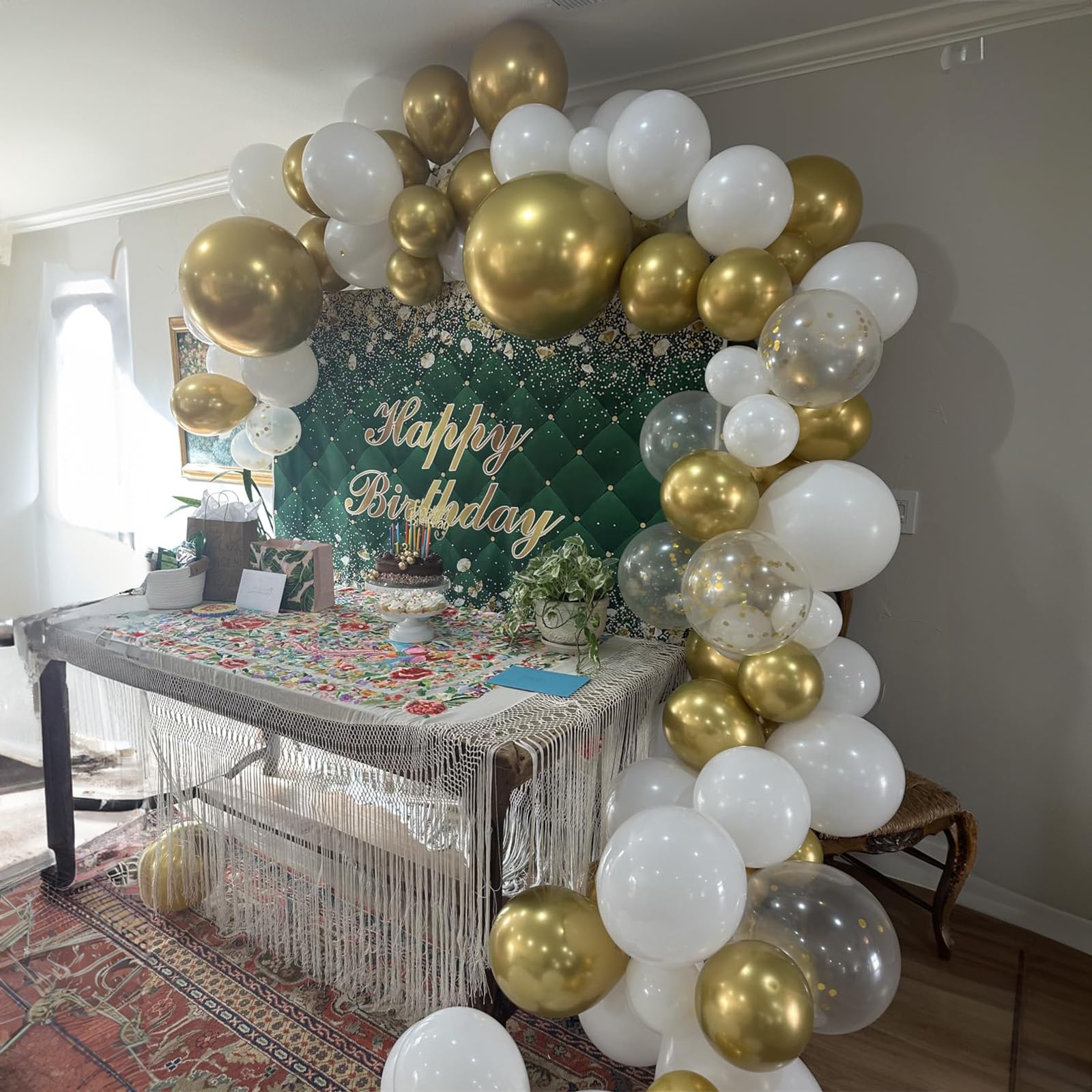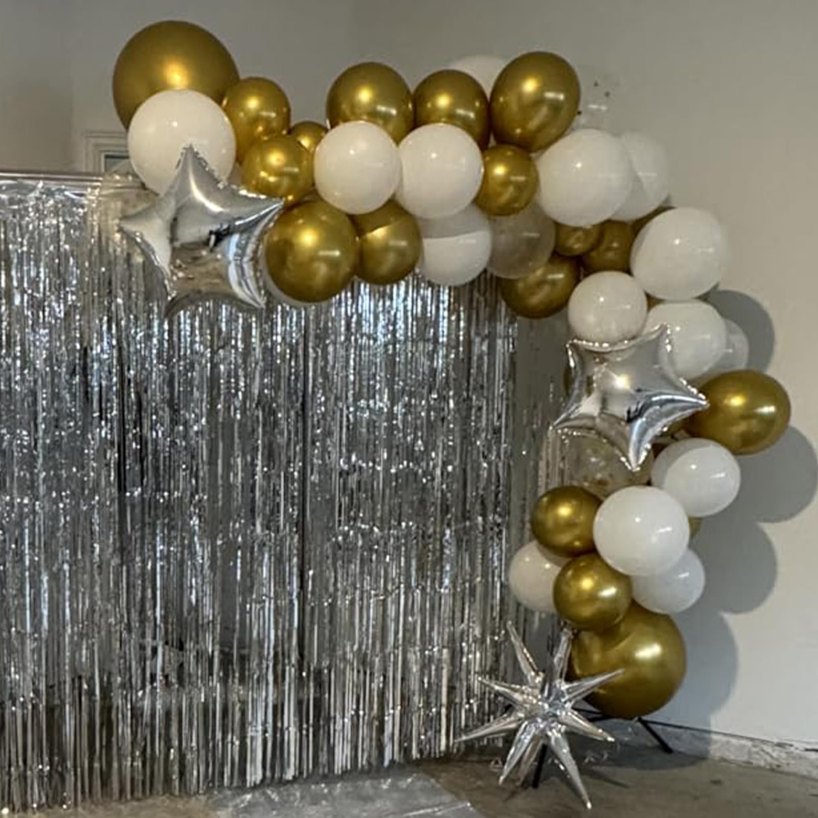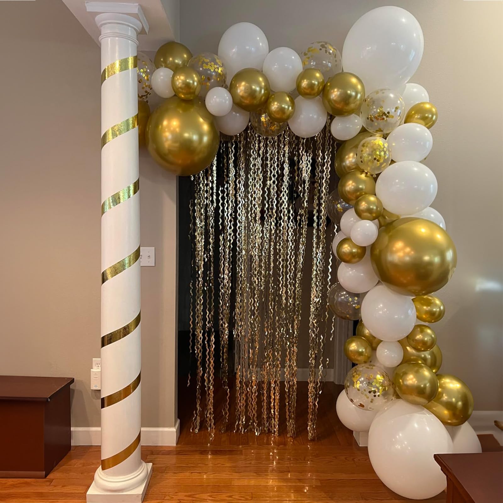 Includes 60 white latex balloons and gold metallic balloons with 2 curling ribbons
