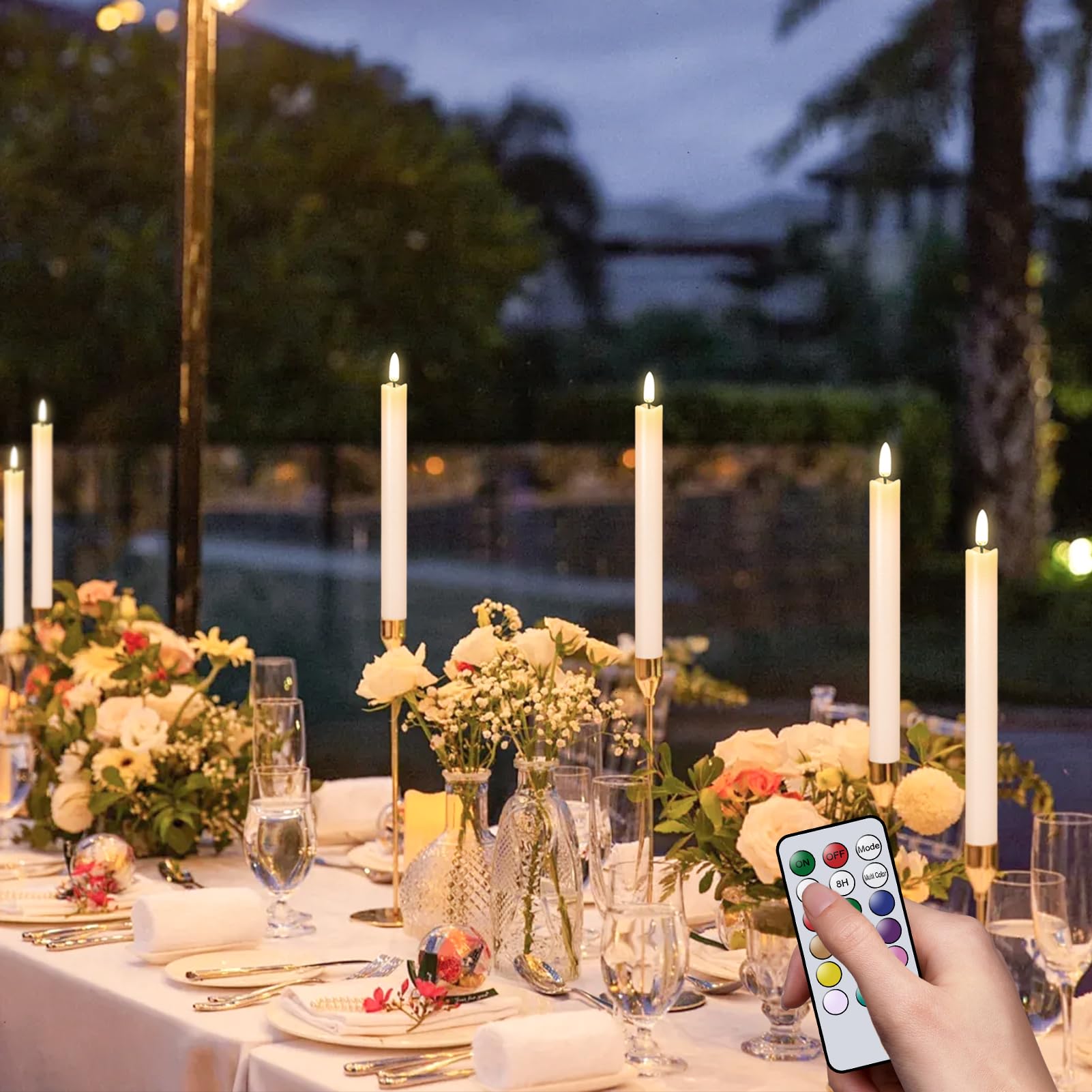 12 COLOR Flickering Wick: You can set different lighting colors using the remote control according to different scene For example, during Halloween, you can choose spooky colors, and during Christmas, you can choose cheerful colors. This led taper candles can maintain the same color simultaneously, or you can set it to a multi-color mode. Breaking the conventional limit of having only one colored light wick! This is where our innovation lies