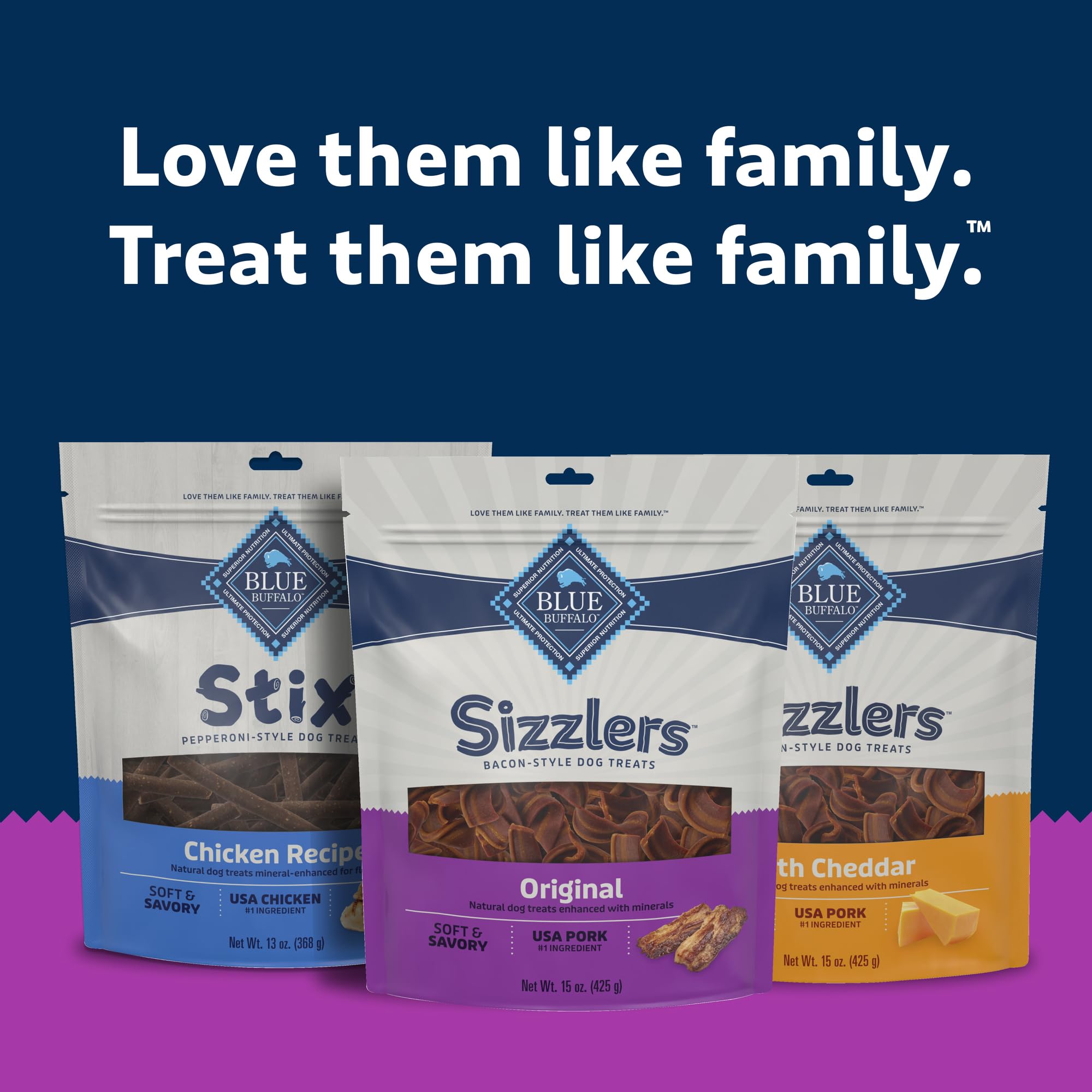 Give your dog the taste of real pork with BLUE Sizzlers Bacon-Style Soft-Moist Dog Treats, Original Flavor. Made with real USA pork as the first ingredient, these tender dog chews look just like real bacon. They're soft and delicious for dogs of all breed sizes and ages. And like all Blue Buffalo dog treats, these treats for dogs don't contain chicken (or poultry) by-product meals, corn, wheat, soy, artificial flavors, or preservatives. Watch your dog's tail wag when you reward them with BLUE Sizzlers Bacon-Style Soft-Moist Dog Treats.