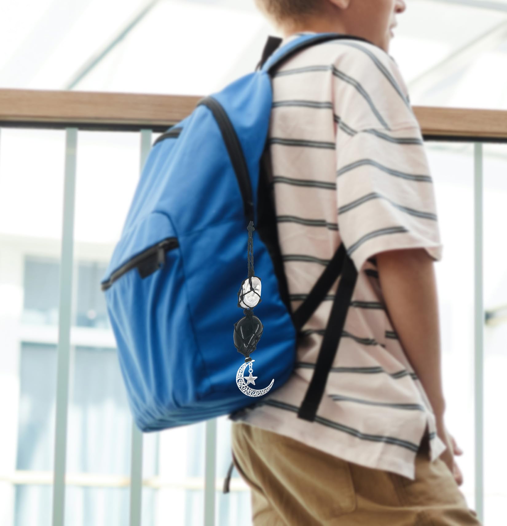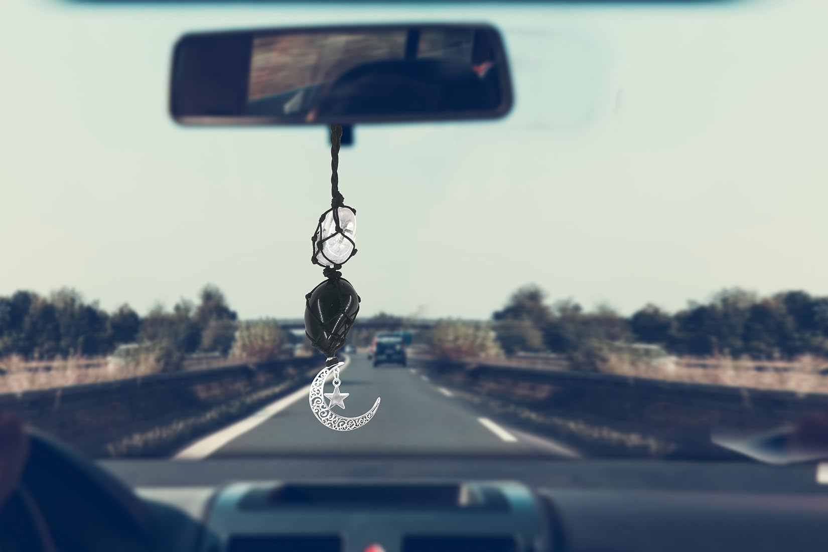 Car charms moon handmade.White crystal black obsidian with a crescent moon and star charm,the shape of each product is unique .for a touch of your personality