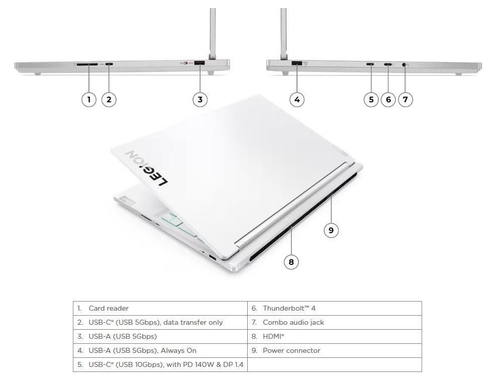 Note: We specialize in computers with personalized configurations. The factory packaging may be unsealed for installation of upgrades to meet the advertised specifications. The modified product will undergo professional testing and then resealed. Operating System Windows 11 Home 64 Processor 14th Generation Intel® Core i9-14900HX Processor (E-cores up to 4.10 GHz P-cores up to 5.80 GHz) Graphic Card NVIDIA® GeForce RTX 4070 Laptop GPU 8GB GDDR6 Memory 32 GB DDR5-5600MHz (SODIMM) - (2 x 16 GB), Two DDR5 SO-DIMM slots, dual-channel capable, Up to 32 GB DDR5-5600 offering Storage 2 TB (1 TB + 1 TB) SSD M.2 2280 PCIe Gen4 (1 TB + 1 TB) - selected upgrade Display 16" WQXGA (2560x1600) IPS 500nits Anti-glare, 100% sRGB, 240Hz, DisplayHDR 400, Dolby Vision, G-SYNC, Low Blue Light Webcam 1080P FHD with Dual Microphone and Electronic Privacy Shutter Color Glacier White Keyboard Per-Key RGB Backlit, White TouchPad Buttonless Mylar surface multi-touch touchpad, 75 x 120 mm (2.95 x 4.72 inches) Battery 4 Cell Li-Polymer 99.9 Wh Power Cord 230W Tiny GaN 30% PCC 3 pin AC Adapter AC Input Power 100 to 240 Wireless Wi-Fi 6E 2x2 AX & Bluetooth® 5.1 or above Dimensions 357.7 x 262.5 x 17.6-19.8 mm (14.08 x 10.33 x 0.69- 0.78 inches) Weight 2.24 kg (4.94 lbs) Ports 1x USB-A (USB 5Gbps / USB 3.2 Gen 1) 1x USB-A (USB 5Gbps / USB 3.2 Gen 1), Always On 1x USB-C (USB 5Gbps / USB 3.2 Gen 1) 1x USB-C (USB 10Gbps / USB 3.2 Gen 2), with Lenovo PD 140W and DisplayPort 1.4 1x USB-C (Thunderbolt 4 / USB4 40Gbps), with PD 140W and DisplayPort 1.4 1x HDMI 2.1, up to 8K/60Hz 1x Headphone / microphone combo jack (3.5mm) 1x Card reader 1x Power connector Docking Various docking solutions supported via Thunderbolt / USB-C