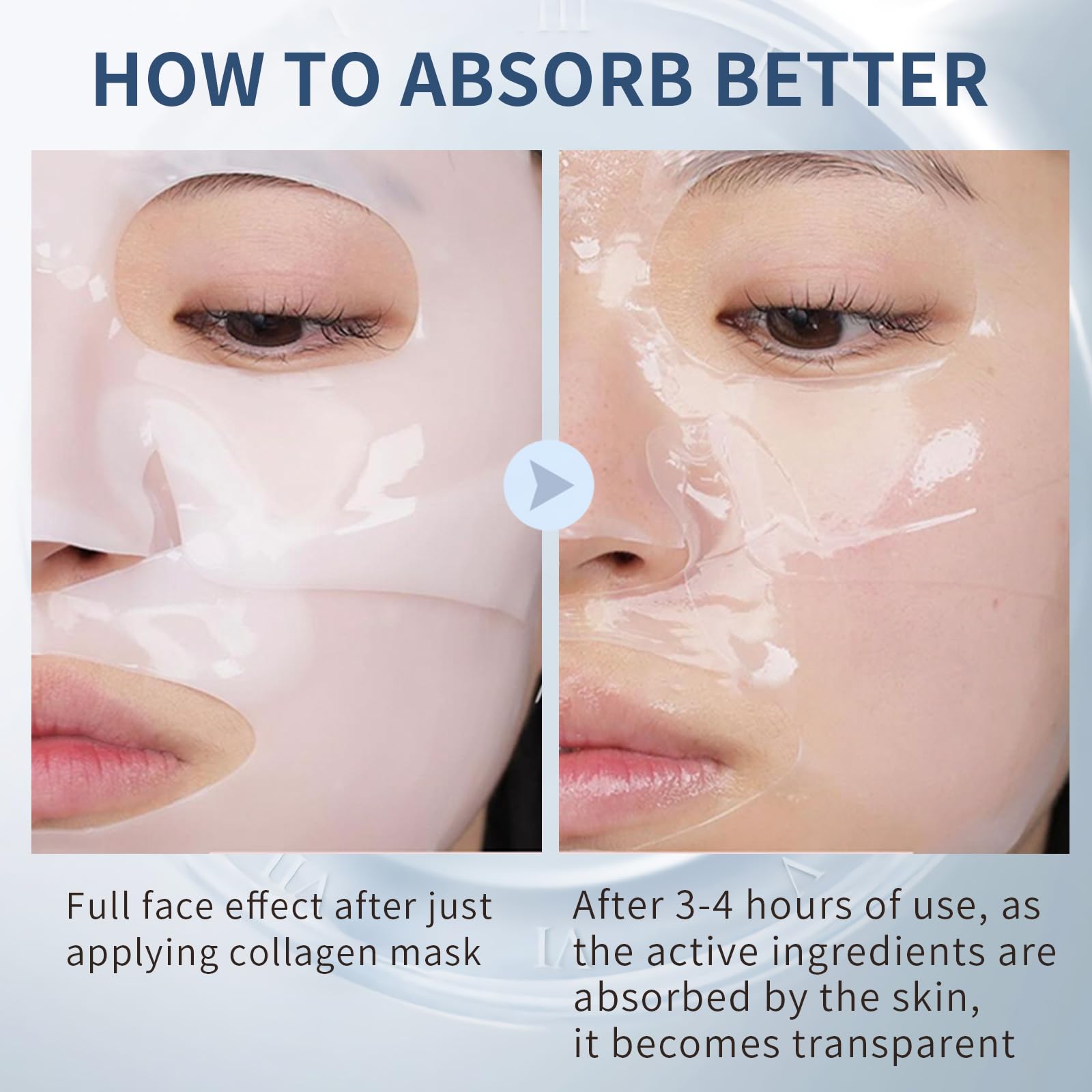 USE EFFECT:Collagen deep facial mask can keep skin moist and smooth for a long time. After 3 hours of use, the collagen hydrogel facial mask is absorbed by the skin and becomes transparent. This facial mask can be used as a sleep facial mask to provide easy elastic care when you sleep and make you radiant!