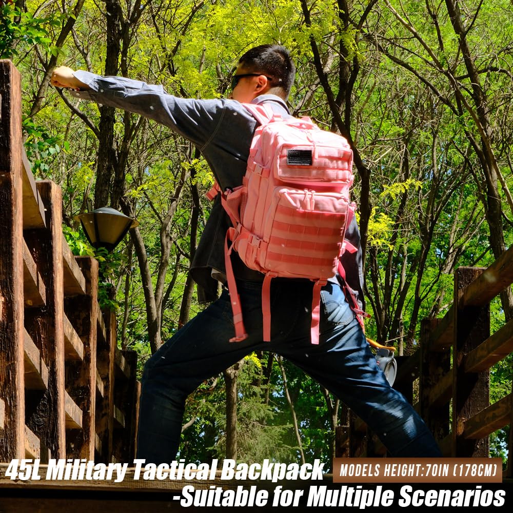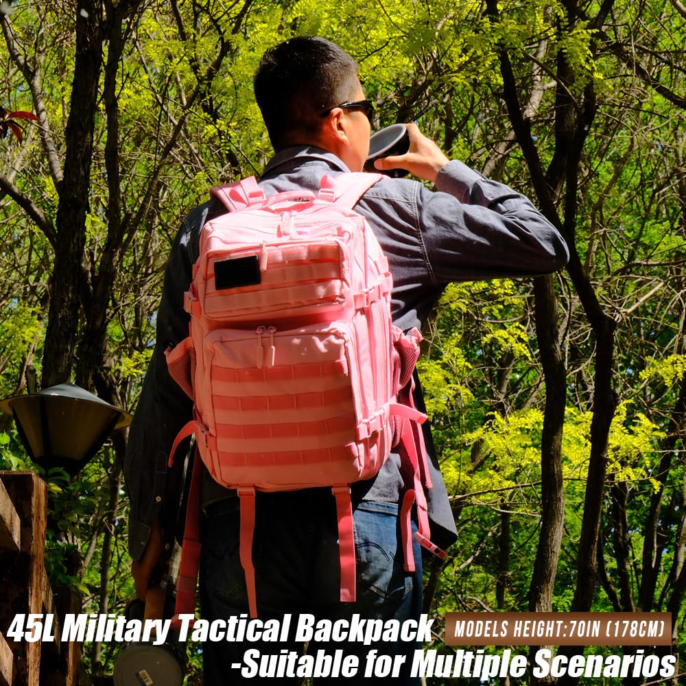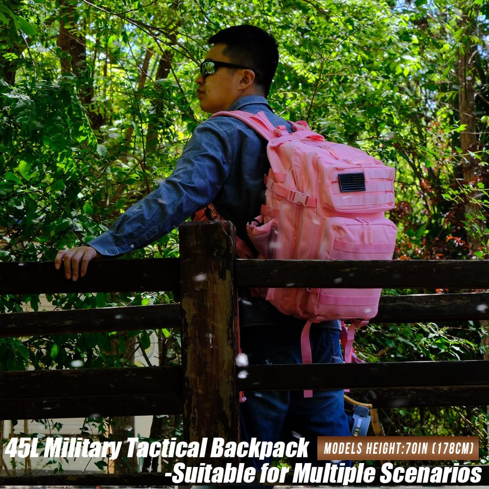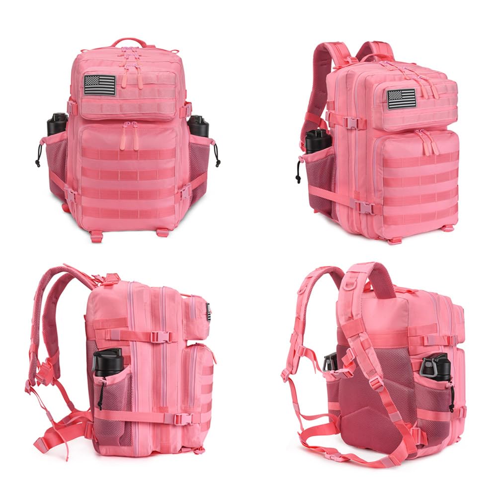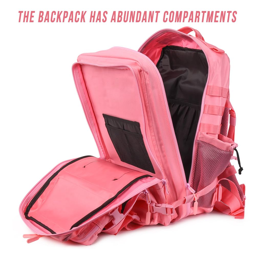 This Pink Tactical Backpack Molle tactical backpack has molle system, Molle webbing throughout for attaching additional tactical pouches or gear.MilitaryTactical backpack with double-stitched, Heavy duty zippers and utility-style cord pulls, Side and front load compression system, mesh padded back area & shoulder strap.