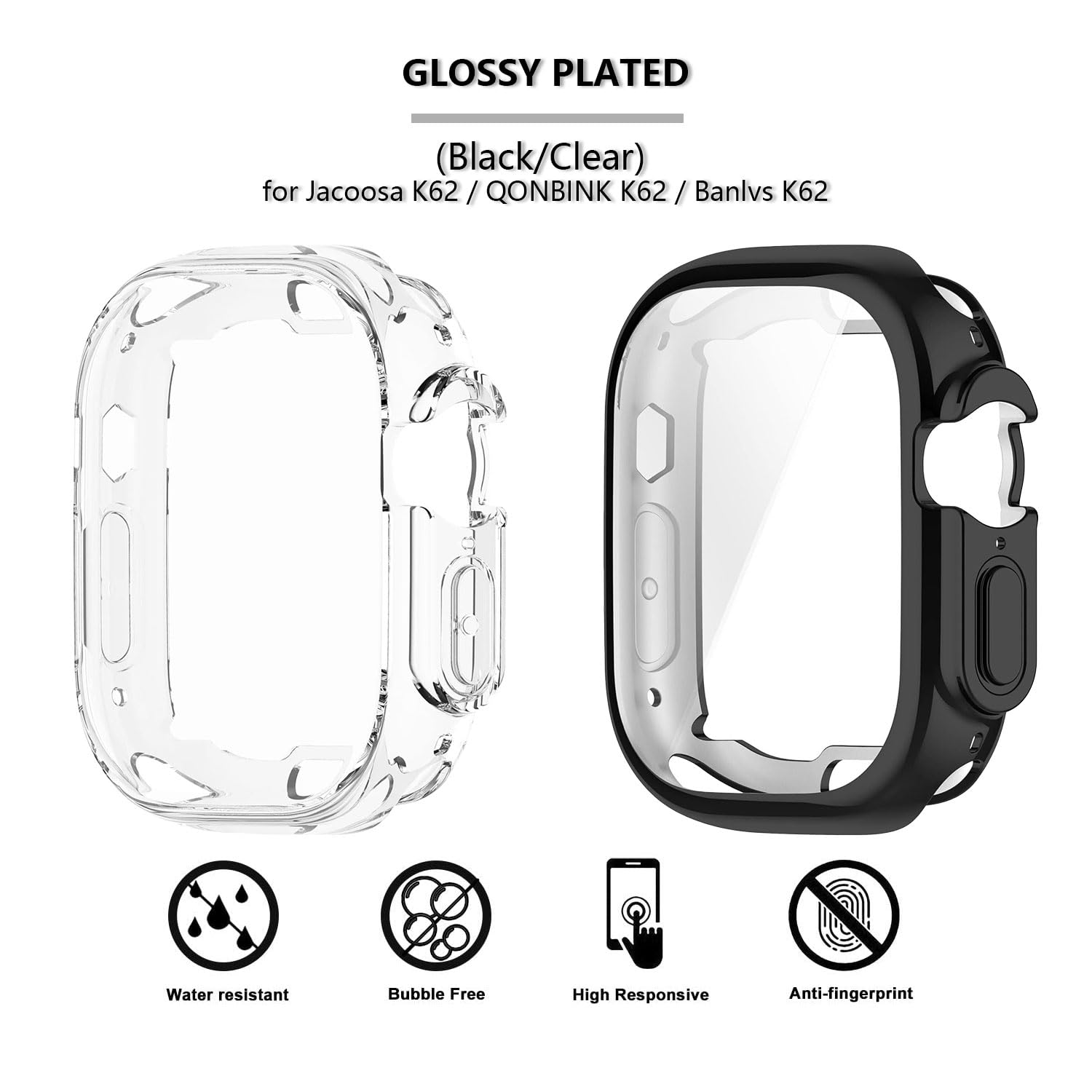 Please Check Your Device Only compatible with Jacoosa / QONBINK / Banlvs K62 All Around Protection 360 degree full protection, keep your watch away from scratches. 99% high transparency, provides a better viewing experience. The colors are bright and very colorful The different colors stay true and don't fade. Easy to install and take off. Gives your smart watch a good and a different look each time Package Included 2 pack screen protector case (clear/black).