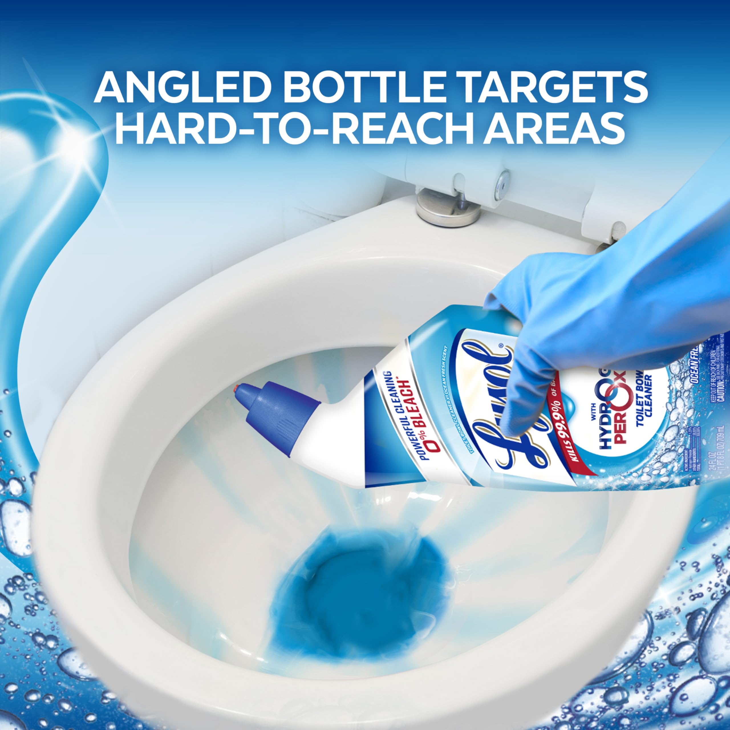 Lysol hydrogen peroxide toilet bowl Cleaner uses hydrogen peroxide to dissolve even the toughest toilet stains. This powerful new cleaning formula uses hydrogen peroxide to release thousands of micro-bubbles that dissolve tough toilet stains. This lime scale remover even cuts through lime scale, without the harshness of bleach. Lysol hydrogen peroxide leaves behind no chemical residues: just a clean, fresh, scent. The thick formula clings to the bowl, brightening your toilet as it cleans and disinfects. The angled bottle targets hard-to-reach areas, including under the rim, leaving your entire toilet bowl sparkling clean, deodorized, and disinfected.