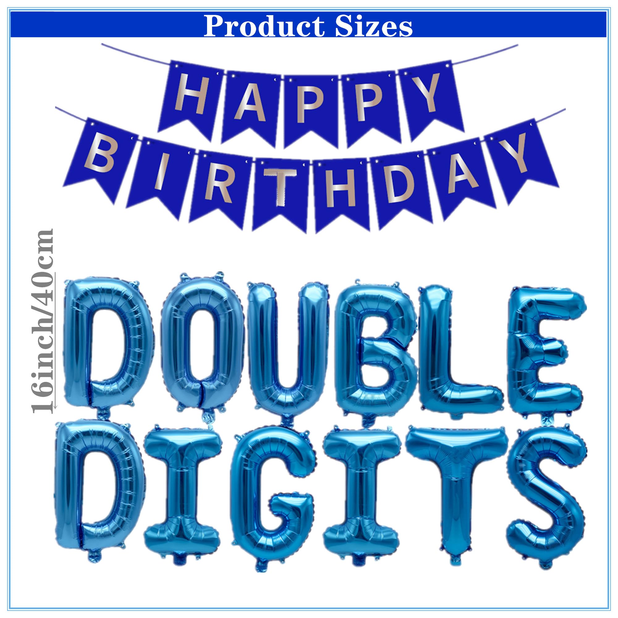 Features: Stunning Backdrops: Transform your party space with blue banners that can also be applied as a backdrop for stunning photo shoots. Elevate Your 10th Birthday Party with Visually Captivating Decorations. Specifications: Material: Paper, Aluminum film, latex Color: Shown as the picture Package includes: 12 x 16inch "DOUBLE DIGITS" banner 1 x "Happy Birthday" banner 2 x 32 inch number 10 balloons 6 x 18 inch blue silver star balloons 30 x 12inch/10inch latex balloons 1 x 10M balloon ribbon 1 x 5M balloon chain Notes: Manual measurement, please allow slight errors on size. The color may exist a slight difference due to different screen displays.