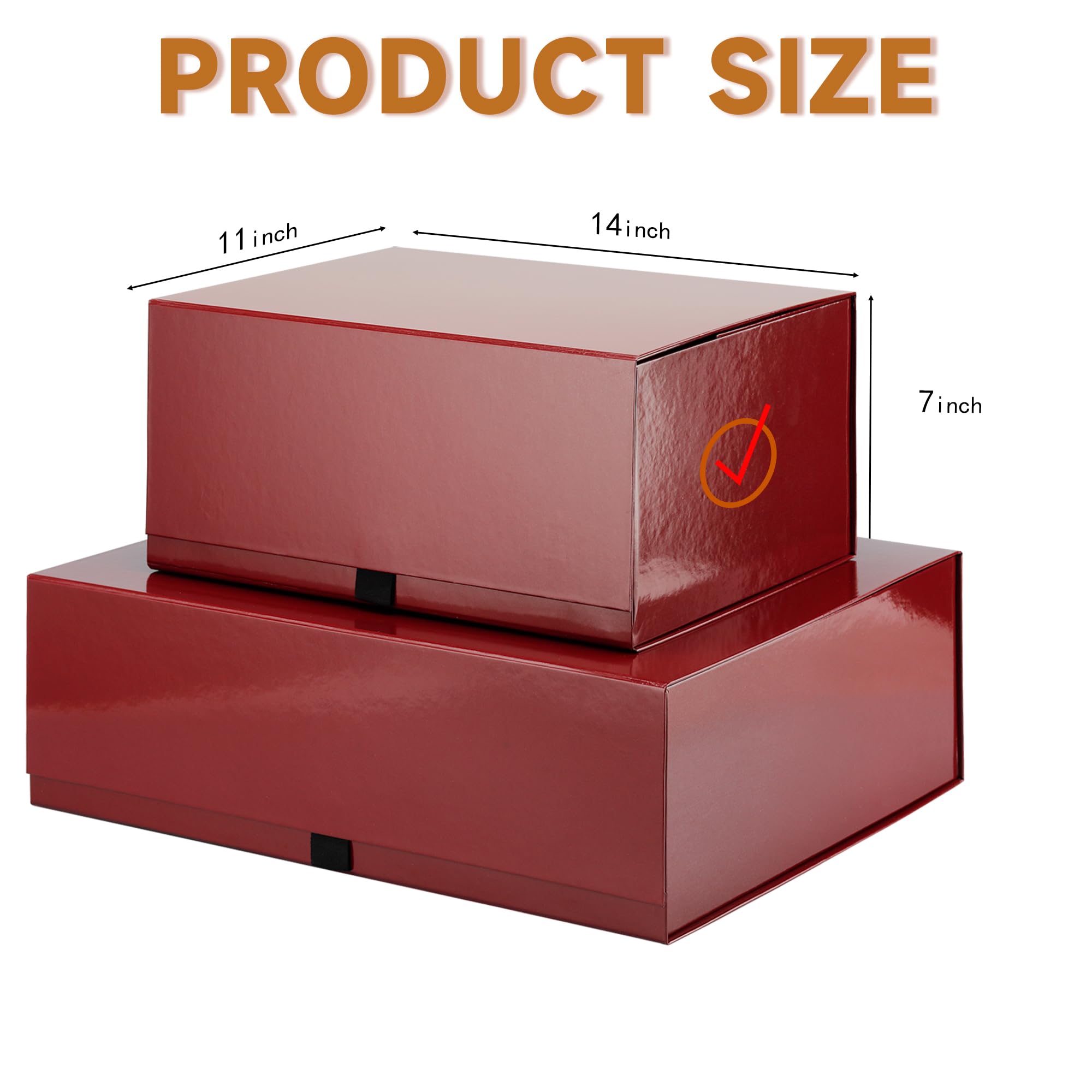 The package contains 2 packs of red gift boxes,and these gift boxes are shipped flat assembled boxes outside measure:14x11x7 inches.Heavy duty book board construction with matte paper over wrap inside and outside.