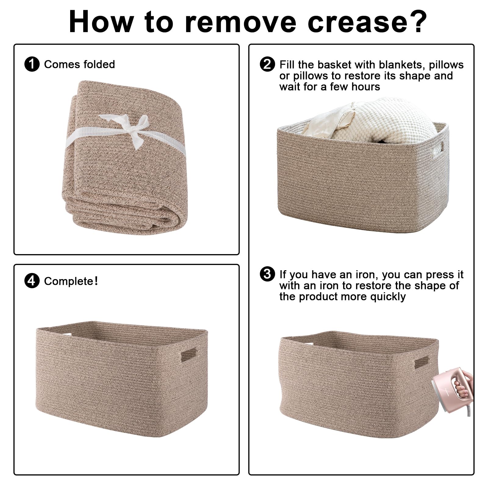 NOTE: The toy basket is folded, but it will turn back to its elegant shape quickly if you fill it with some pillows or blankets, and iron is great idea to remove the creases