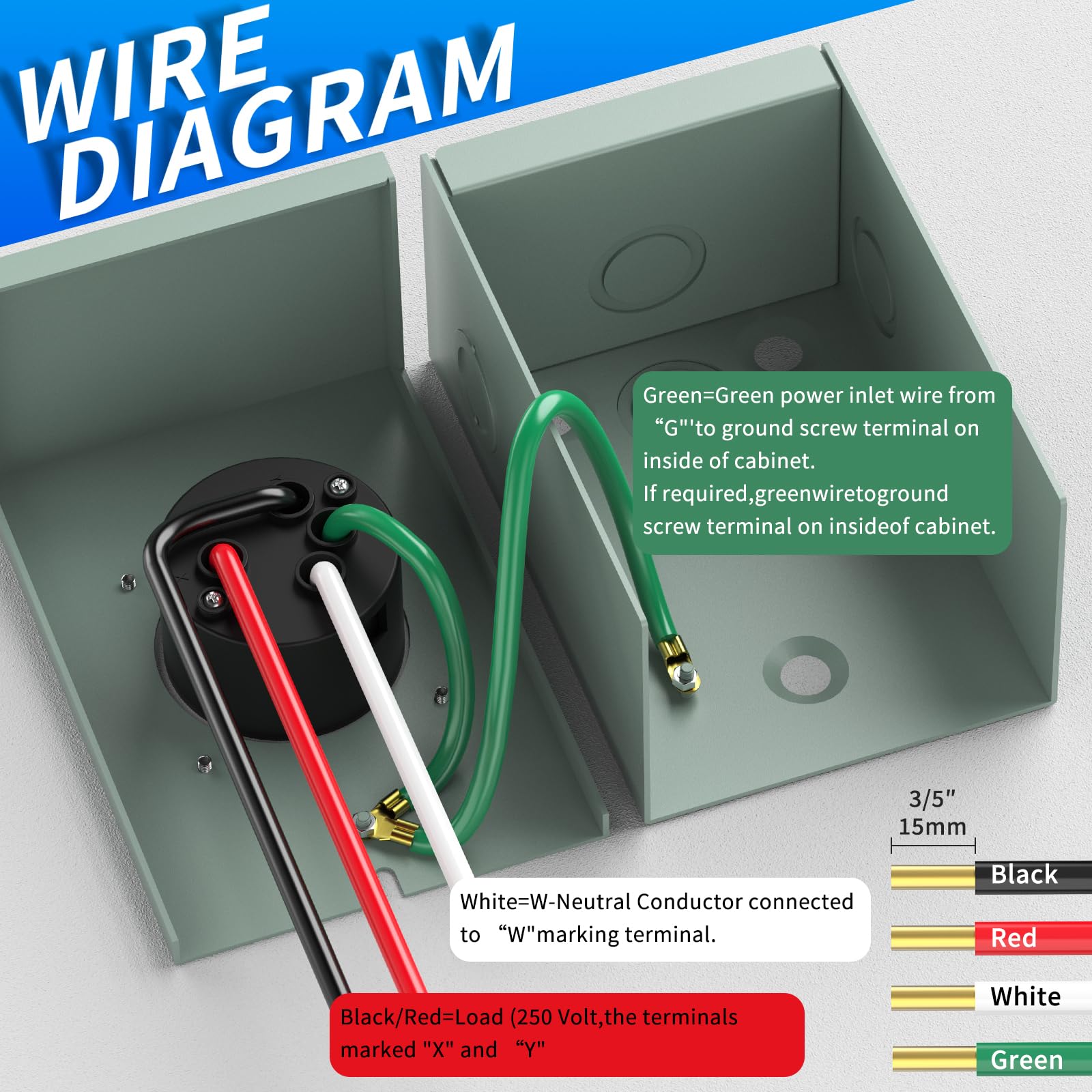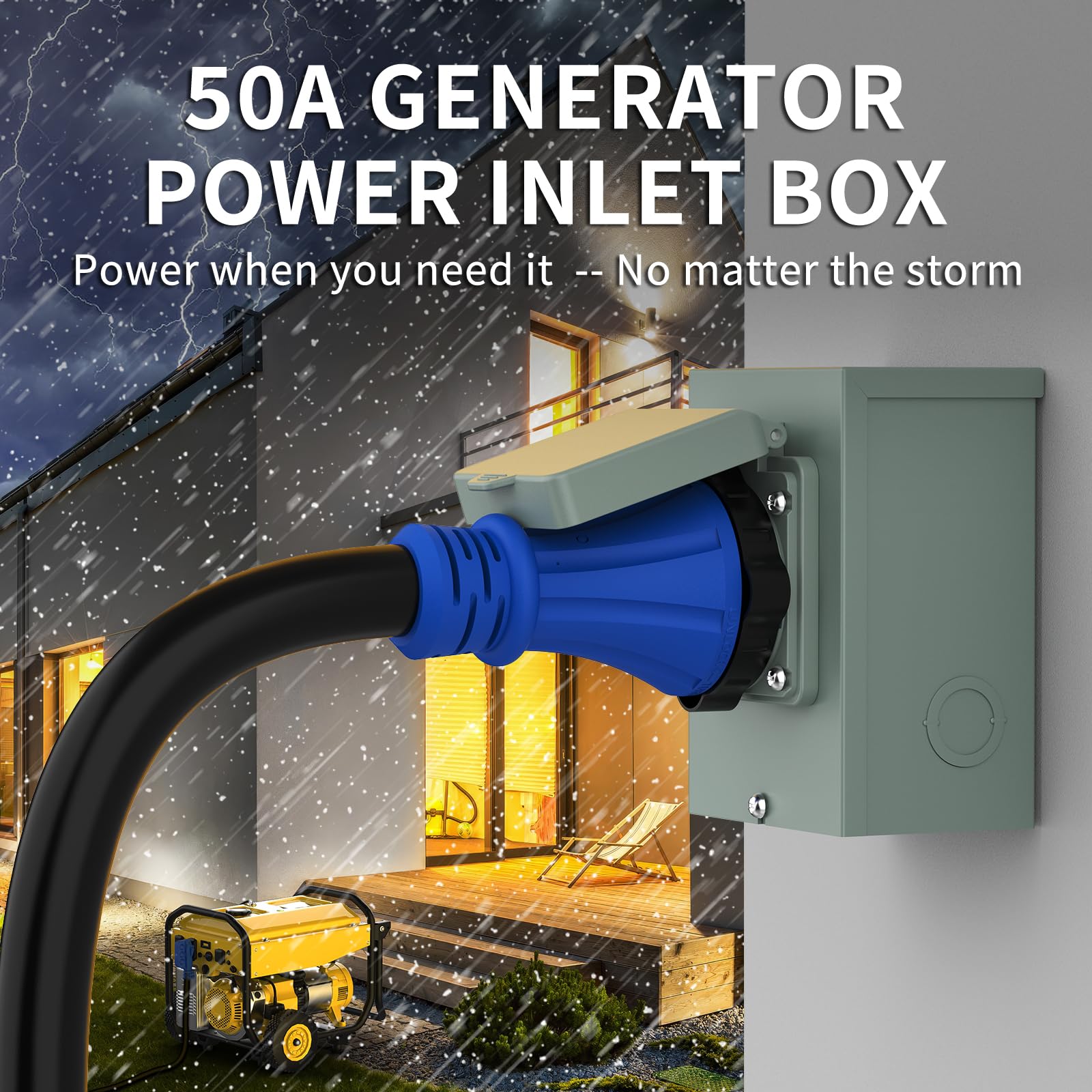 【ETL Listed】50 Amp, 125/250V, 7500W Power Inlet Box, equipped with SS2-50P male configuration, for use with all generators up to 7,500 Running Watt. Maximum support for 10 AWG wires. When insufficient power and bad weather such as tornadoes and blizzards, power inlet box continuous backup power can be provided and maintained from the generator outside.