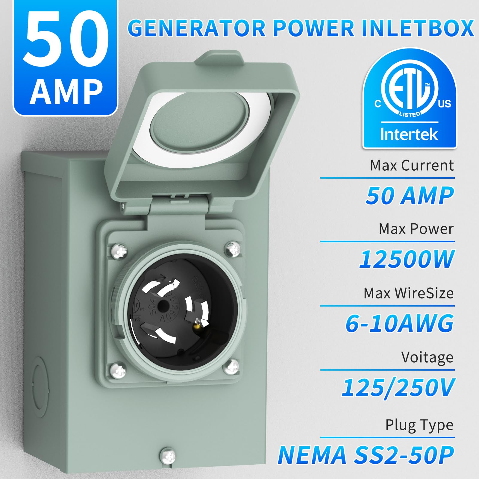 Generator Inlet Box, 50 Amp NEMA PB50, SS2-50 Power Inlet Box for 3 Prong Generator Cord, 12500W 125/250V Receptacle for Outdoor Use, Generator accessories,Weatherproof, ETL Listed