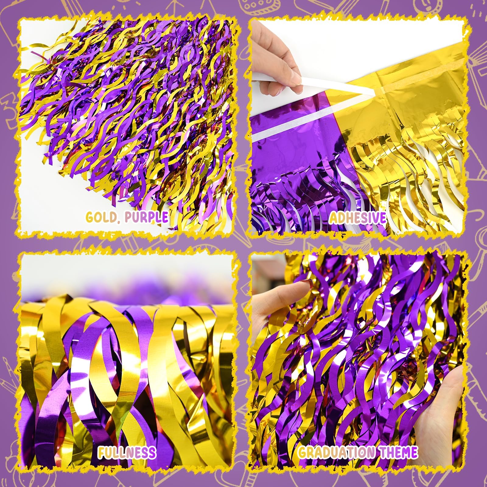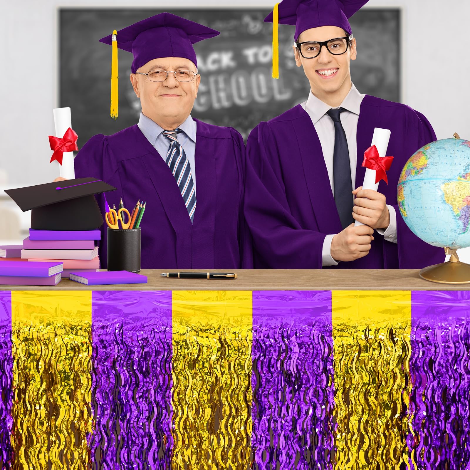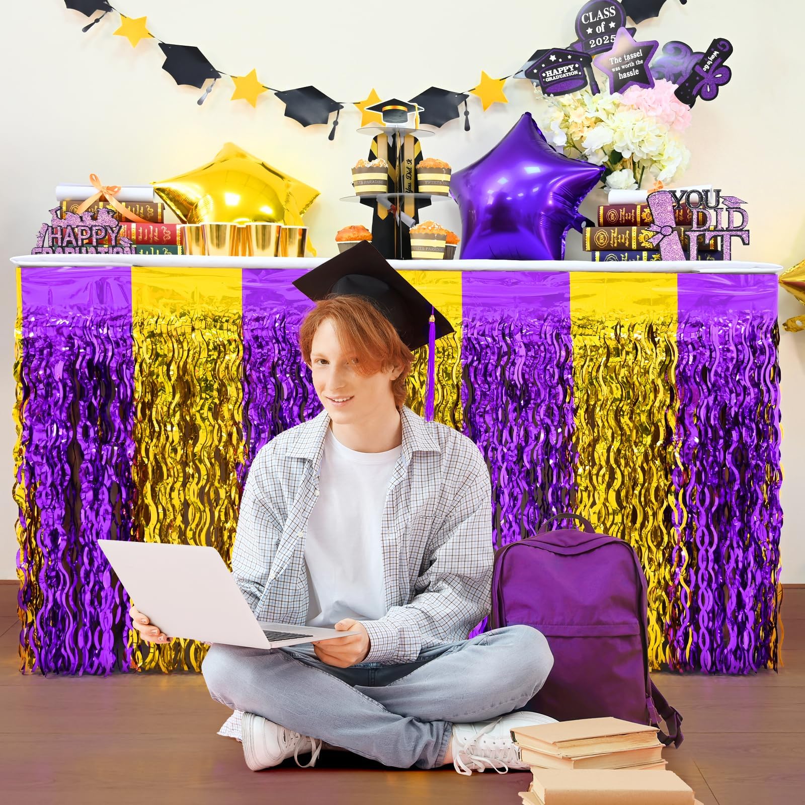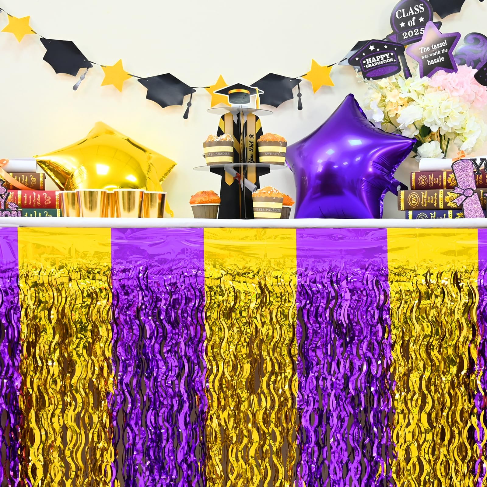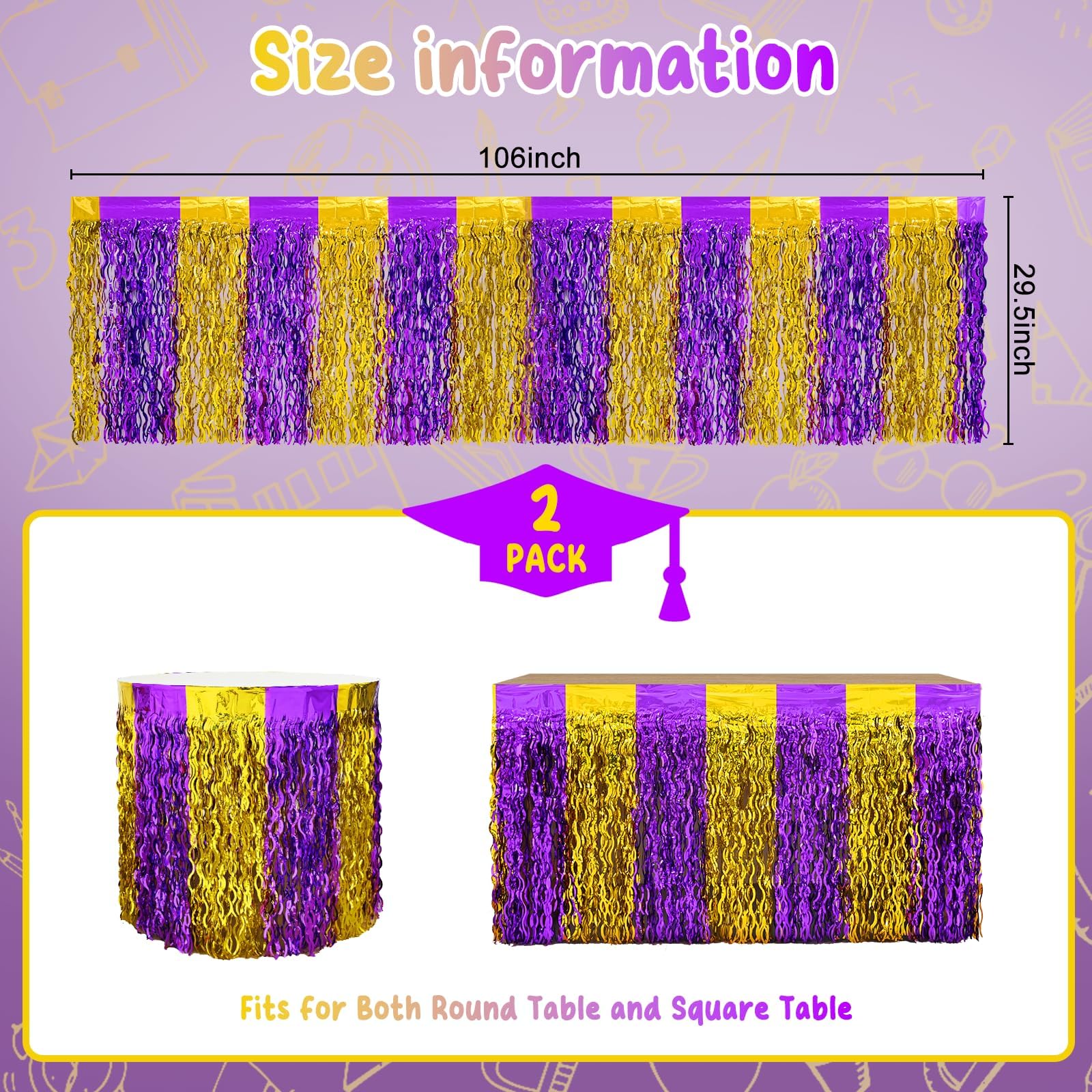 🎓【 PACKAGE 】: 2 pack purple gold foil fringe table skirts. Each skirt measures 106 x 29.5 inches (width x drop), providing you with ample coverage to adorn your party tables.