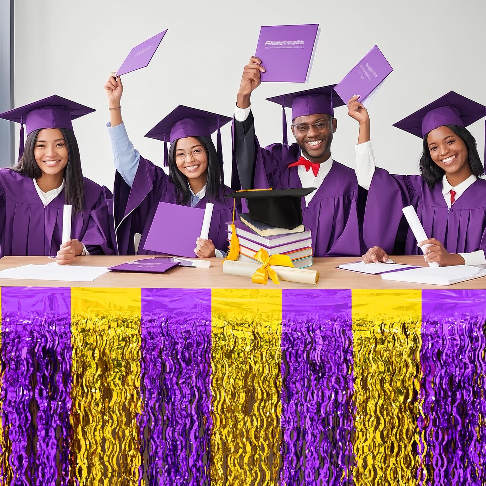 🎉【 TINSEL MATERIAL 】: Our Graduation-themed metallic foil fringe table skirt are made of high-quality tinsel material. Its shiny surface adds a touch of sparkle to your Graduation decorations, while its lightweight and durable design ensures longevity.