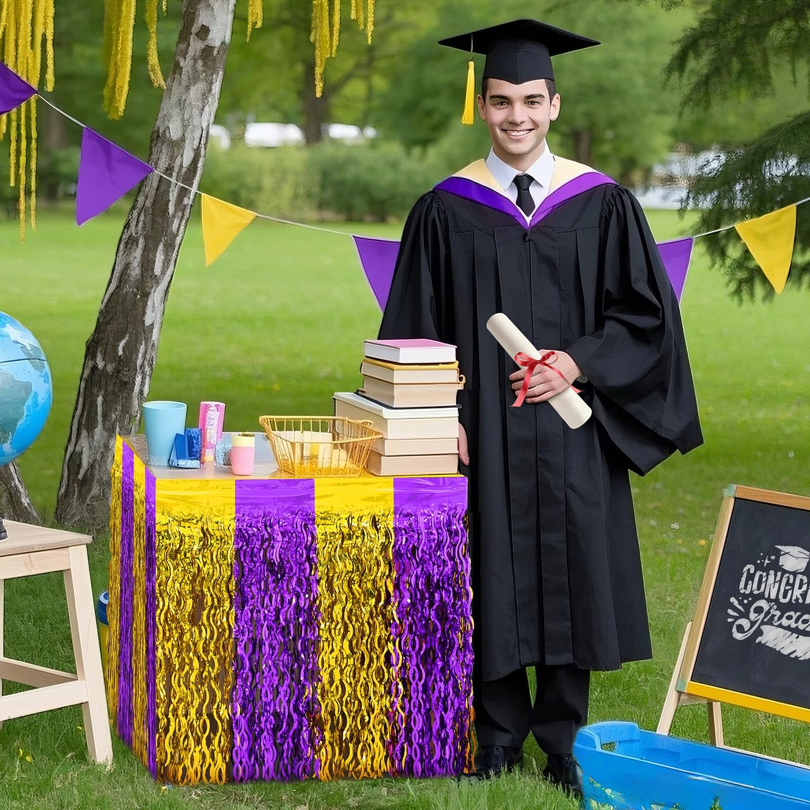 🎓【 WIDE OCCASIONS 】: Our Graduation wavy foil fringe dessert table skirt adds a delight touch to your celebration. Perfect for Graduation and prom parties, its shimmering design creates an unforgettable atmosphere for any occasion.