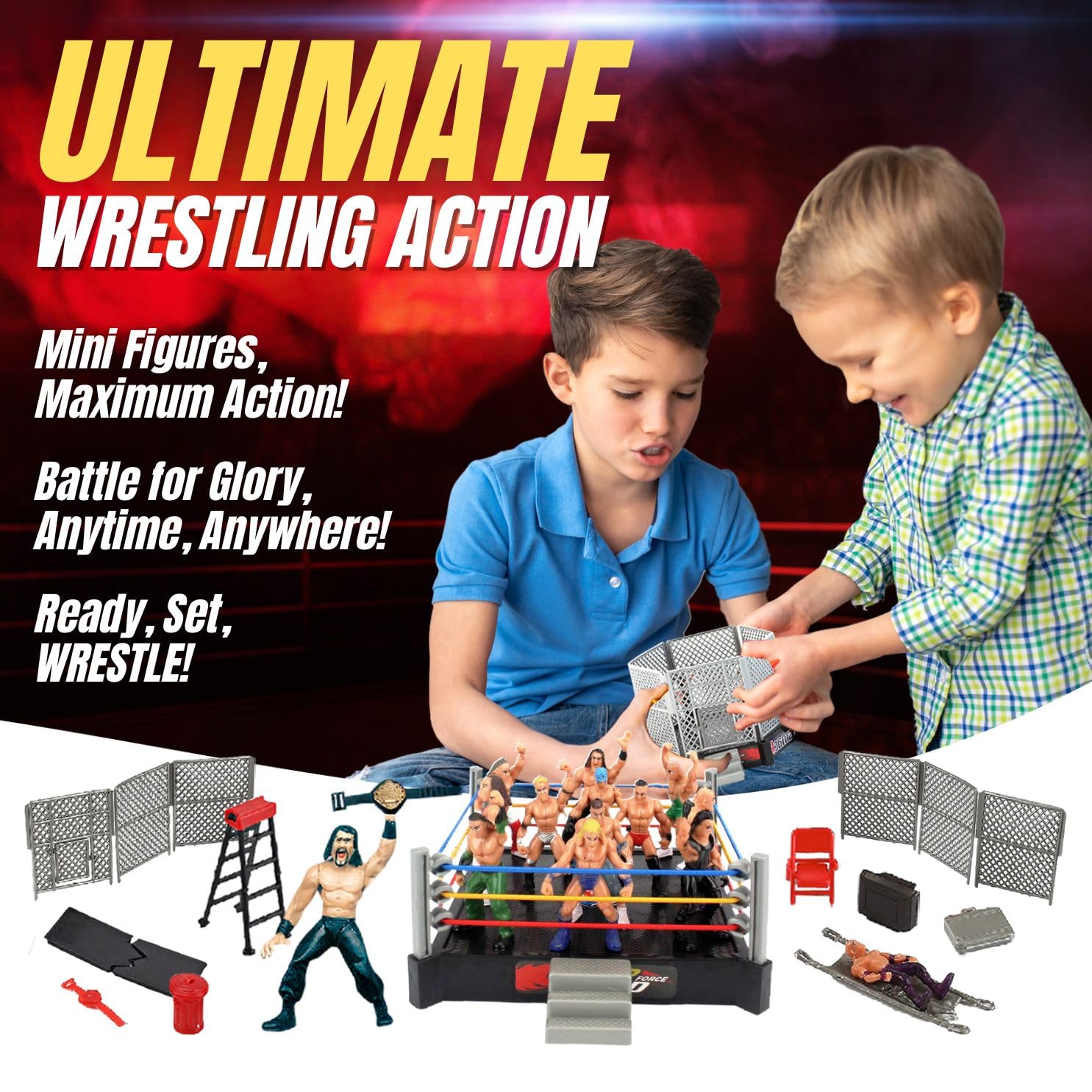 32-Piece Wrestling Playset: All-inclusive miniature wrestling set featuring 12 assorted 2" wrestlers, realistic accessories like a table, trash can, ladder, and more; perfect for recreating your favorite wrestling moments