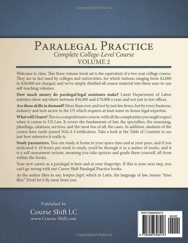 In June 2023 we made our popular Paralegal Practice course available to the general public as a three volume set of books at extremely affordable pricing. With these books you can enter into the high-paying legal field as a truly competent and professional paralegal, often with more knowledge under your belt than some first year lawyers! Welcome to class. This three volume book set is the equivalent of a two year college course, and is by no means just an orientation or a set of guidelines. Our trainees have taken positions with law offices with more practical knowledge and capabilities than first year lawyers, and we’ve received letters from law firms to that effect. This course is in fact used by colleges and universities, for which tuition ranging from $2,000 to $20,000 are charged, and we’ve simply distilled all course material into these easy-to-use self-teaching volumes. You can acquire them one at a time, or as a set. Let’s get right to your questions. How much money do paralegal/legal assistants make? Here’s a summary breakdown from the latest Department of Labor statistics: Federal government $69,680 Finance and insurance $64,740 Local government, excluding education and hospitals $58,300 State government, excluding education and hospitals $49,350 General legal services $48,270 Are these skills in demand? More than ever, and not by just law firms, but by every business, industry and tech sector in the US which requires at least some in-house legal expertise. What will I learn? This is a comprehensive course, with all the complexities you might expect when it comes to US Law. Don't let that intimidate you, if in fact it does. It covers the fundaments of law, the specialties, the reasoning, pleadings, citations, services, and the most fun of all, the cases. In addition, students of the course have easily passed NALA Certification. It expands your knowledge in a comfortable and step-by-step way, utilizing a hands-on research-based system innovated by the author. Have a look inside at the Table of Contents to see just how extensive the curriculum really is. When you complete it, you'll be in possession of more knowledge than you can believe, and you'll be well-prepared for any career covered by the scope of this course: paralegal, legal clerk, legal secretary, legal transcriptionist, etc. Study parameters. You can study at home in your spare time and at your pace, and if you dedicated 6-10 hours per week to study, you’d be through it in a matter of weeks, and it is a self-assessment system, meaning you take quizzes and grade them yourself, all from within the books. Another beauty of this system is that you can also just pick from it what you might need to learn to add to your knowledgebase in any career capacity that requires some background in law. And you might be surprised at how valuable an employee or contractor can be when they have practical legal knowledge under their belt. Your new career as a paralegal is here and at your fingertips. If this is your next step, you can’t go wrong with our Career Shift Paralegal Practice books. For decades, our goal is to help you succeed. Now it’s up to you. Get going! For, as the author likes to say, tempus fugit (time flies).
