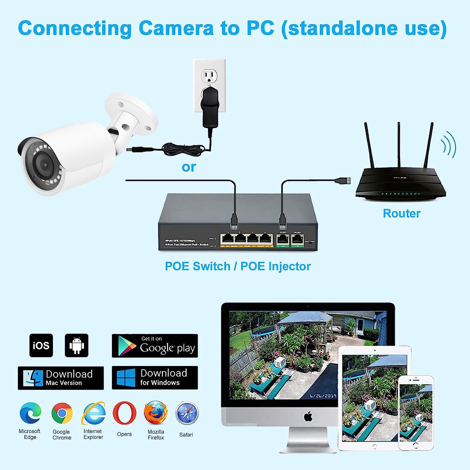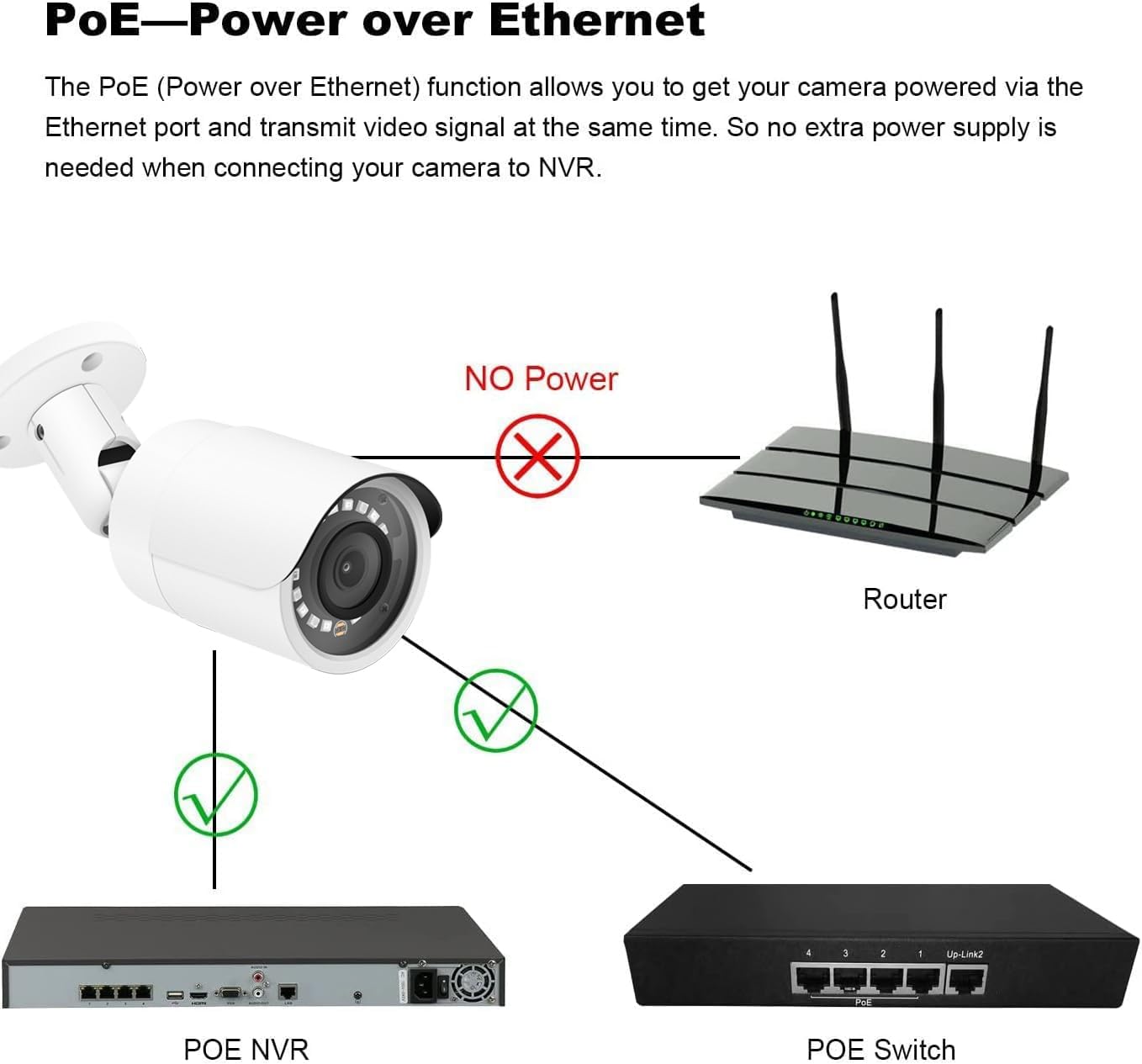 【Power over Ethernet (PoE) & Plug and Play】The PoE camera allow IP (internet protocol) devices to receive power and data over existing LAN (local area network) cabling.