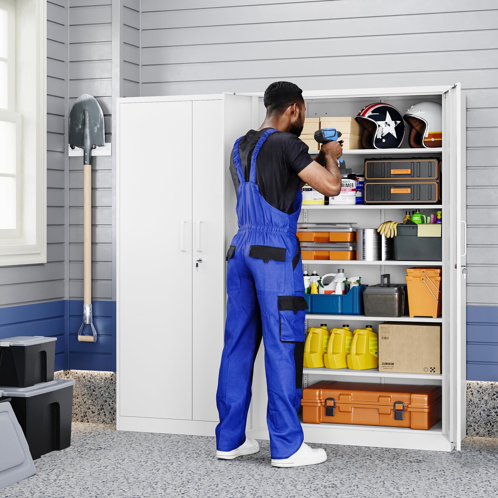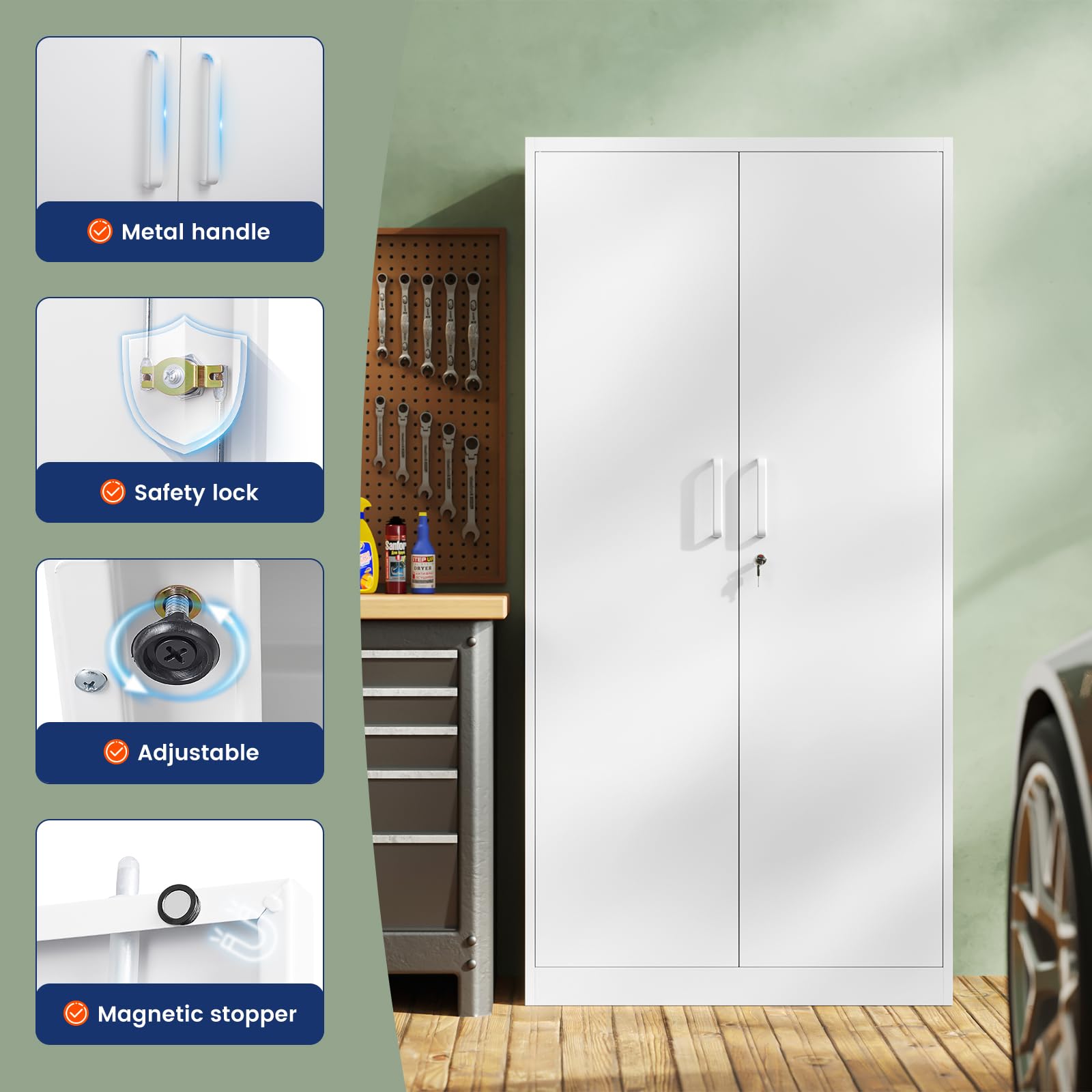 『HIGH QUALITY MATERIAL』:Whole-in-one reinforced heavy duty metal frame, load capacity up to 180lbs per shelf solid and strong.Environmental protection powder, scratch resistance and rust-resistance.Our metal storage cabinets are made of heavy gauge cold-rolled steel plate, sturdy and durable