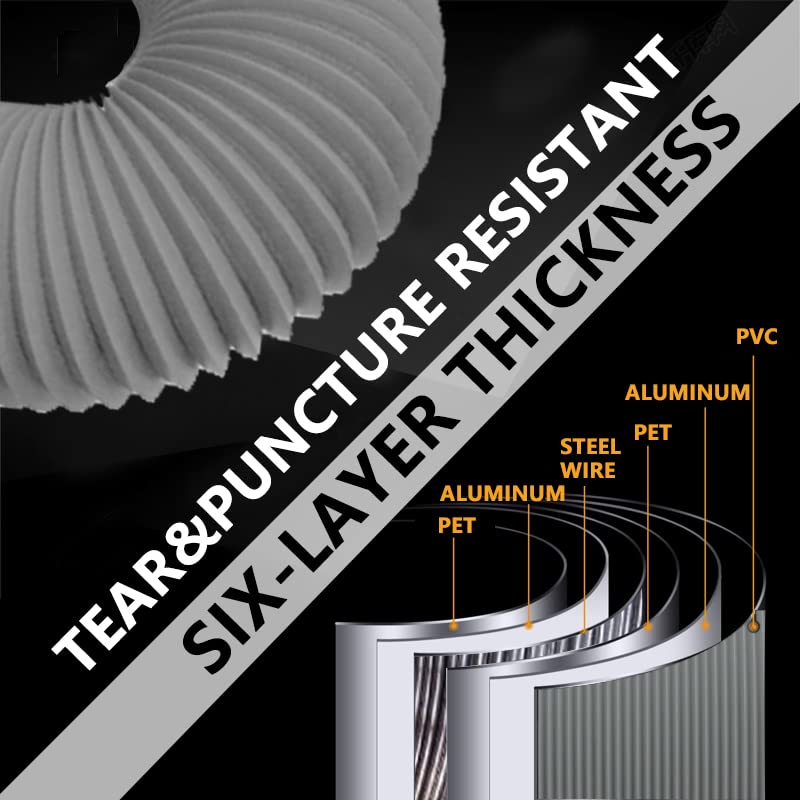 [Six-layer thickness]:The Dryer Vent Hose is made of 6 layers thickness(2 Aluminum Foil +2 PET +Steel wire+ PVC),The hose steel wire diameter is 1mm prevent deformation.The PVC film help to be light-proof,noise reduction and Insulation.