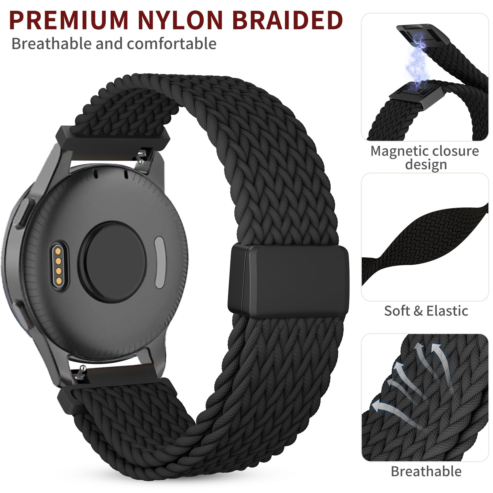 Description CUNUJIX Stylish Nylon Stretchy Bands Compatible with 20mm Garmin Venu/Venu Sq/ Venu Sq 2/ Venu 2 Plus/Vivoactive 5/ Vivoactive 3/Forerunner 645/245 Music ect Compatible Model: Compatible with Garmin Venu Compatible with Garmin Venu Sq / Venu Sq Music Compatible with Garmin Venu Sq 2 Compatible with Garmin Venu 2 Plus (NOT for Venu 2S/Venu 2) Compatible with Garmin Vivomove Compatible with Garmin Vivomove 3(NOT for Vivomove 3s) Compatible with Garmin Vivomove Style / Vivomove Luxe / Vivomove HR Compatible with Garmin Vivoactive 3 / Vivoactive 3 Music Compatible with Garmin Vivoactive 5 Compatible with Garmin Vivoactive 6 Compatible with armin Garmin Forerunner 245 / Forerunner 245 Music Compatible with Garmin Forerunner 245 / Forerunner 245 Music --- Please Choose the Correct Watch Model and Size for Yourself ---