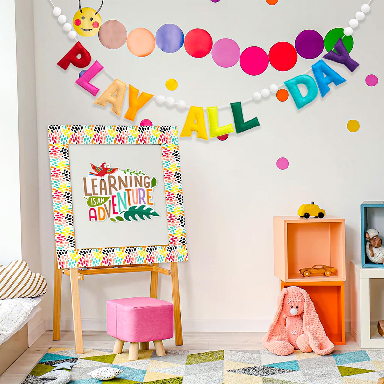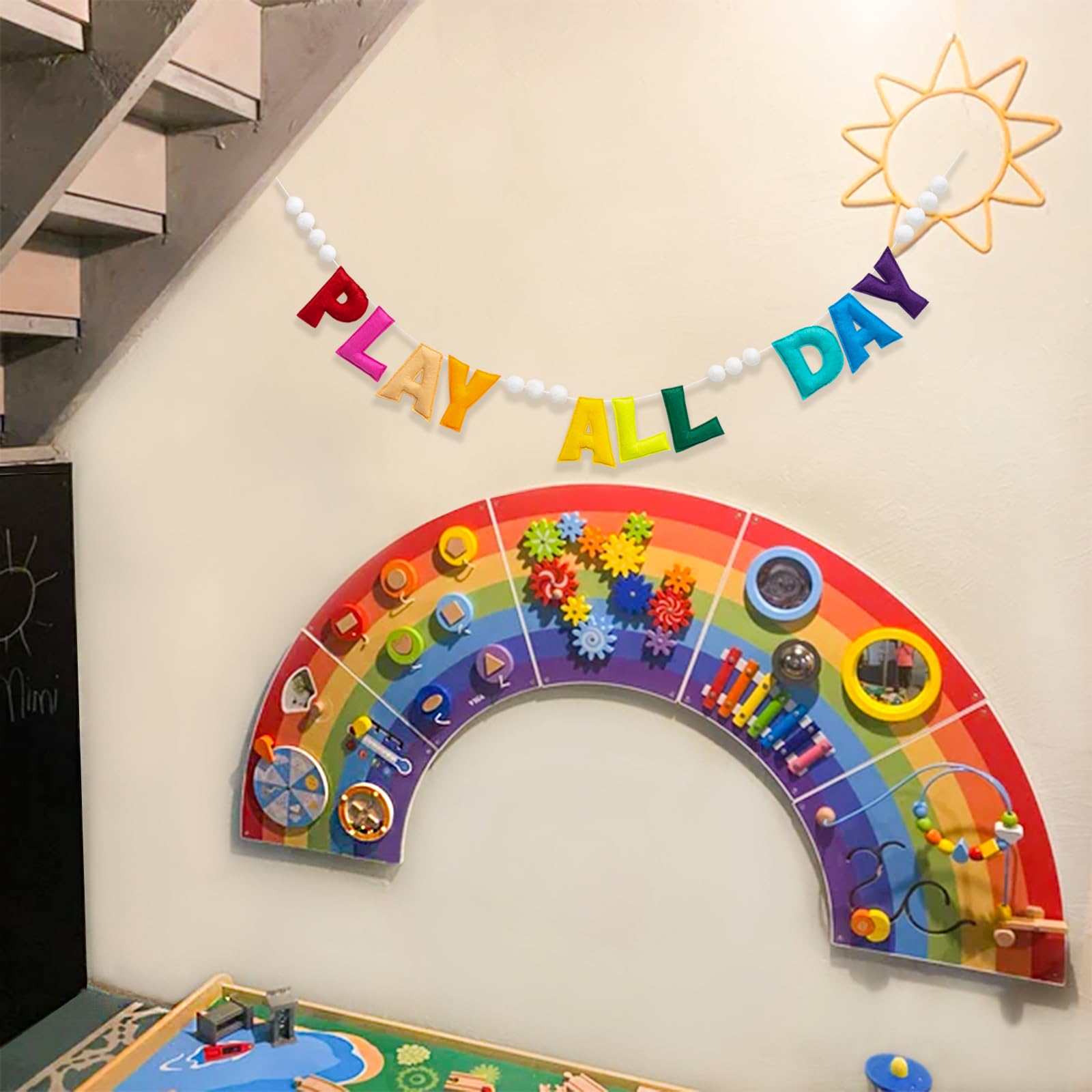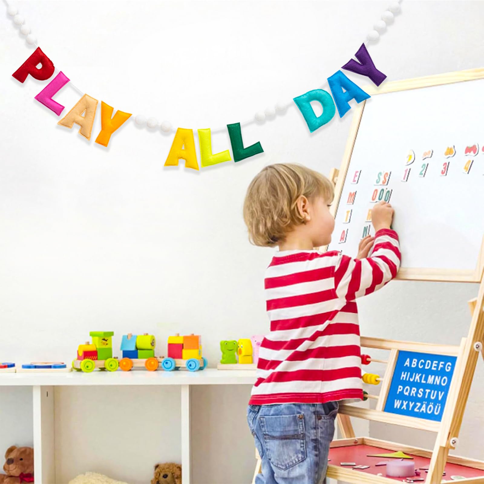 【PLAY ALL DAY BANNER - PLAYROOM ESSENTIALS】- This cute kids' wall play sign says "play all day" in a cute and whimsical style, perfect for any playroom, toy room, bedroom, nursery, and more! This garland is the perfect addition to any playroom, nursery or kid's room! It's a motto loved by all kids! It's easy to hang and can be used year after year.
