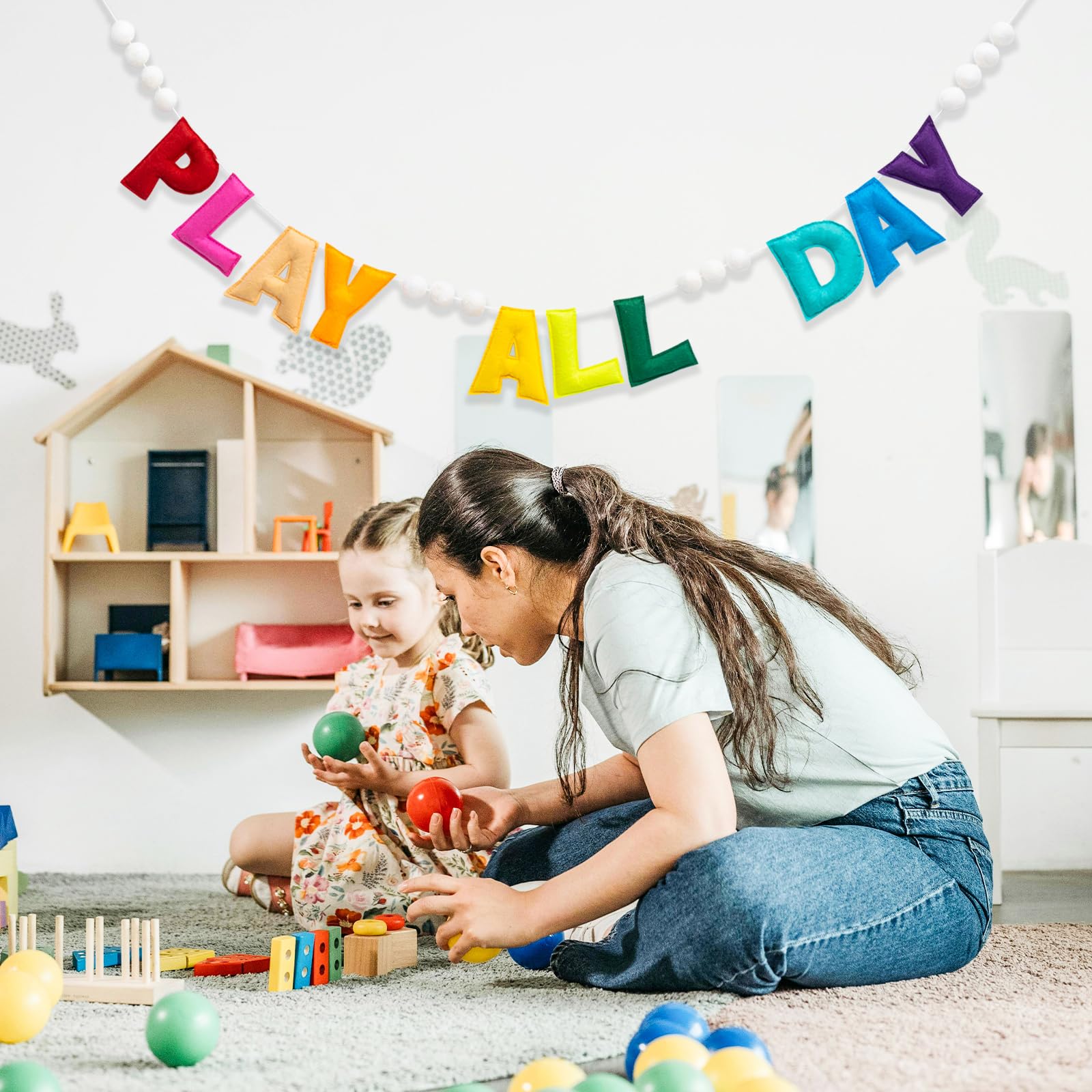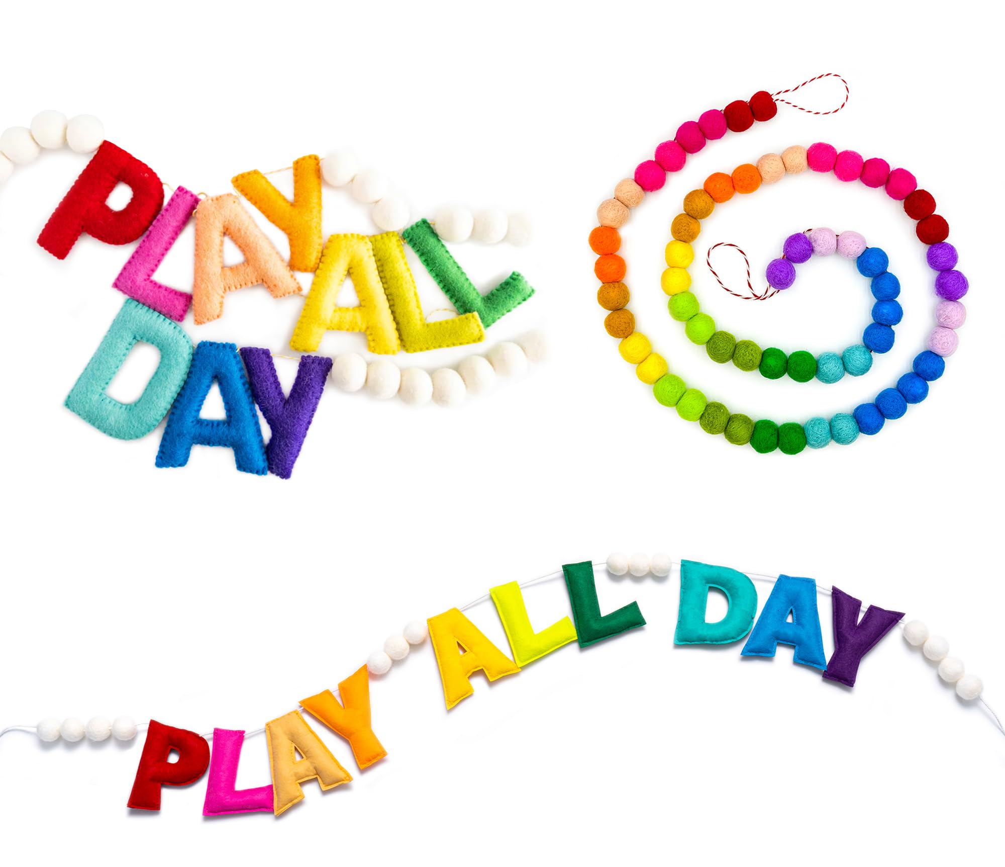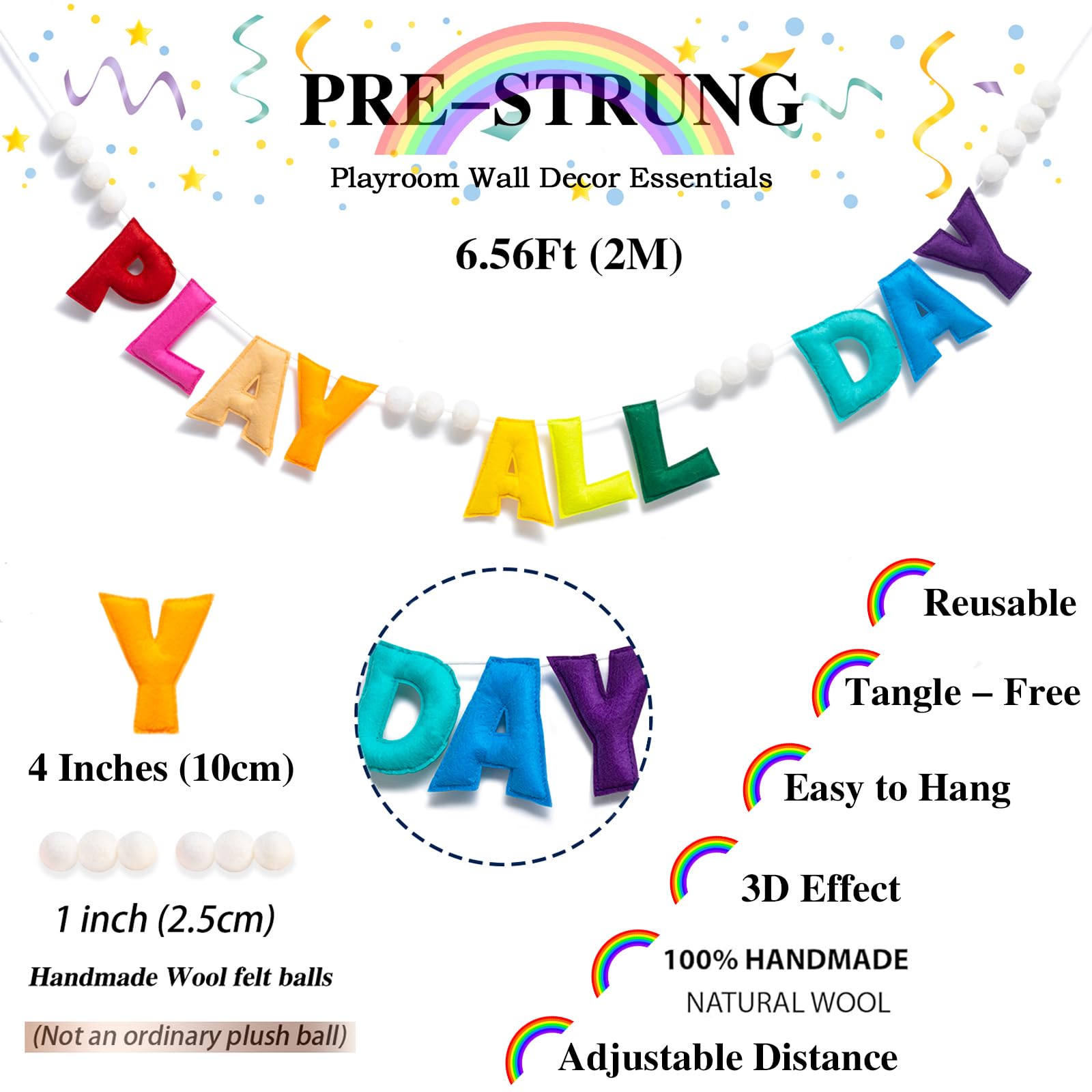 【PRE-STRUNG, NO DIY REQUIRED! EASY TO HANG】- Unlike others, our Rainbow play All Day Banner will arrive to you with each letter and wool balls already pre-strung on white twine. Letters and Balls can easily be moved for spacing in between. No wasted time putting them together All you have to do is hang and you’re ready to go. Simple yet effective way to style a wall in a playroom, nursery, bedroom, above storage, etc. It will also make a great gift.