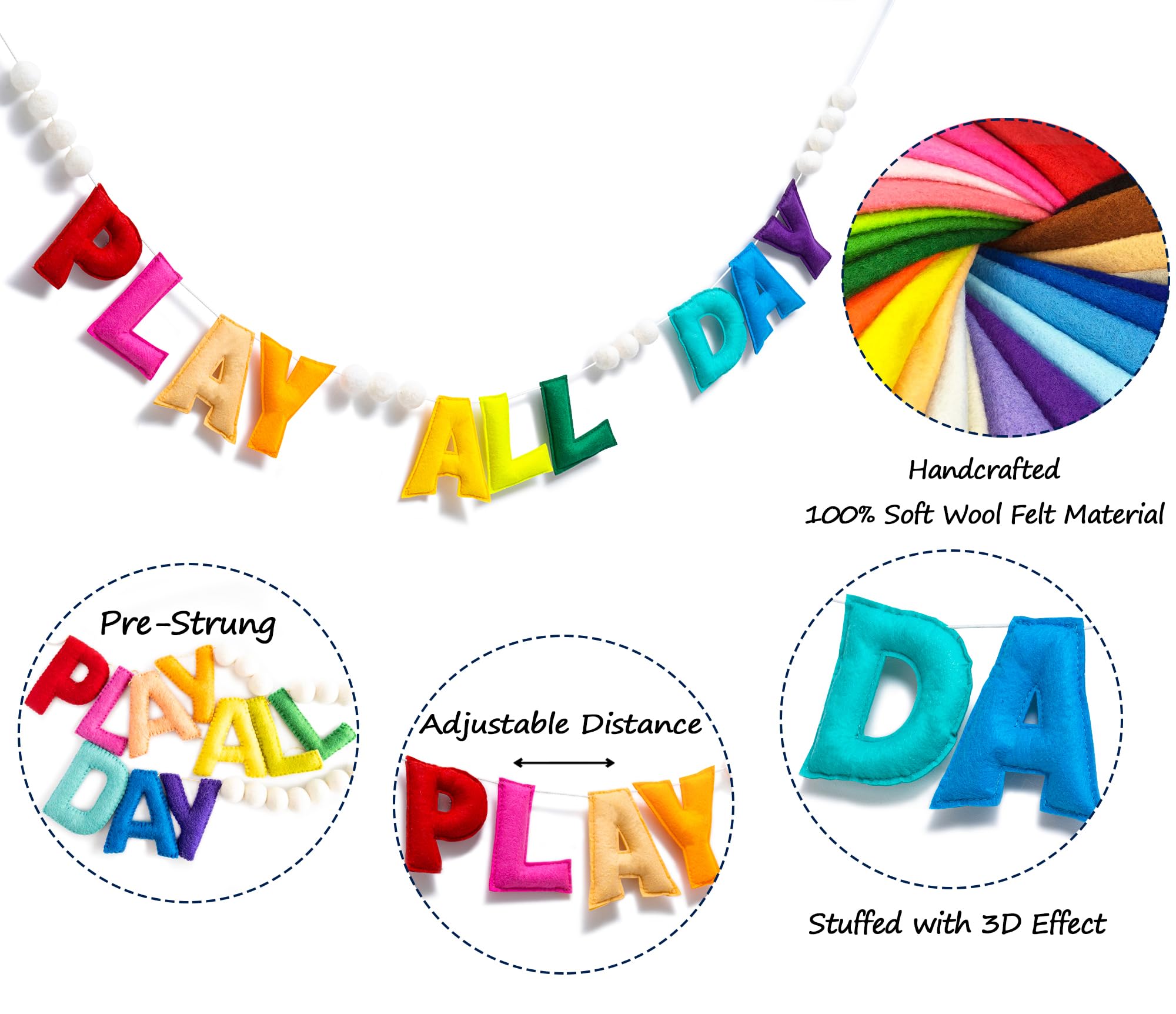 【DURABLE & REUSABLE MATERIAL】- The letters are made from high quality soft wool felt that has been carefully cut out, stuffed and sewn for a 3D effect. It will last for years! This Play All Day Felt Garland can be reused year after year. And it's lightweight and flexible, you can hang these letters with comfort and ease around the children's playroom anywhere, making it a joyful space of fun. No need to worry about wall damage or the risk of falling. - Letters made of soft wool felt material (4 inches) - 100% wool felt balls (1 inches) - White hemp cord