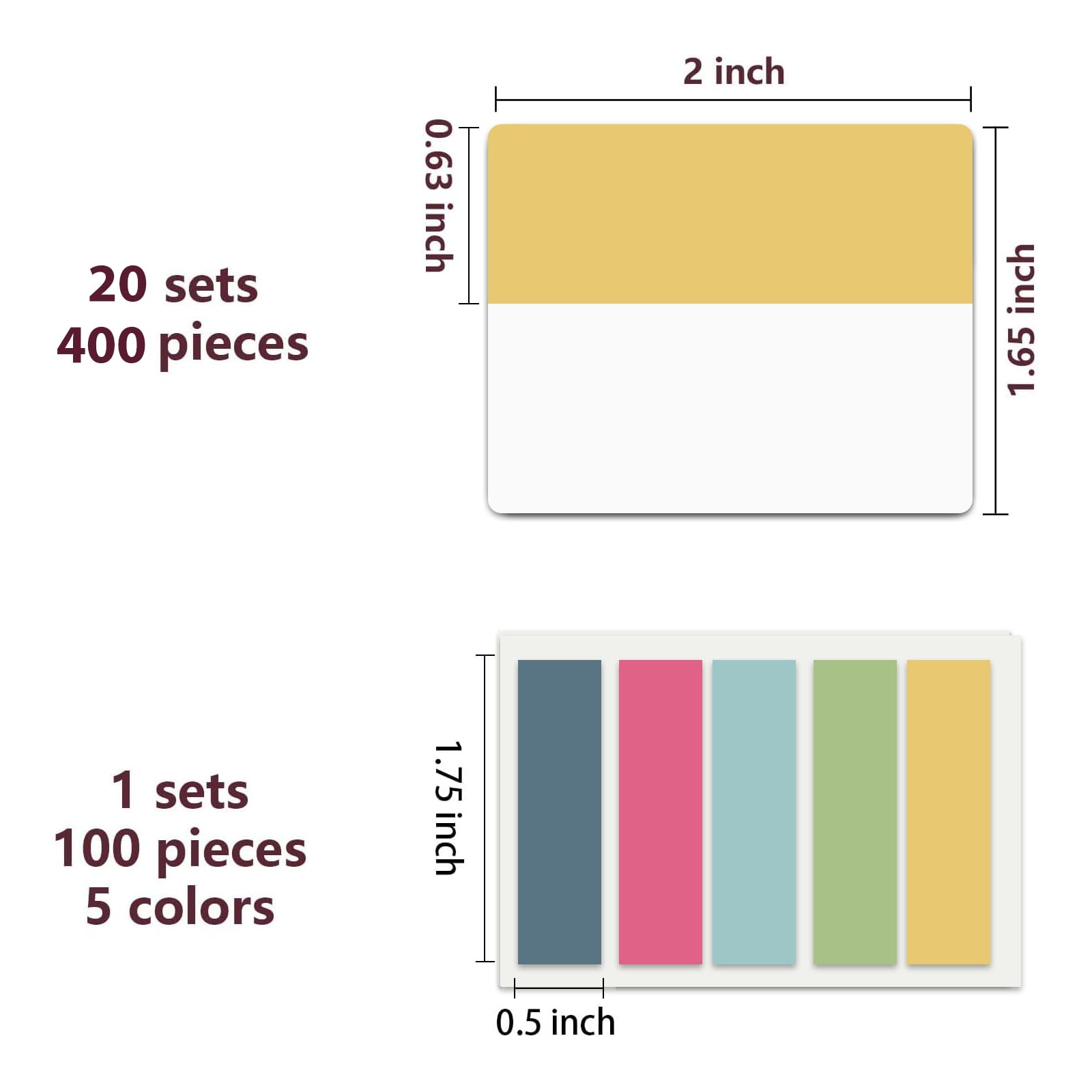 500 pieces Tabs: 500 pieces 21 sets in total, 400 pieces 2 inch sticky tabs in 20 sets with different pastle colors,100 pieces 0.5 in tabs in 1sets, 20 pieces each color