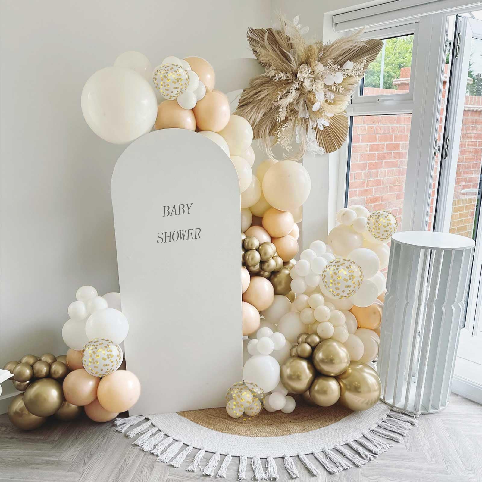 White and Gold Confett Balloons Set: 35pcs 12 inch latex balloons, include 12pcs sand white latex balloons, 10pcs apricot latex balloons, 8pcs retro metallic gold latex balloons, 5pcs gold confetti balloons and 1pc ribbon