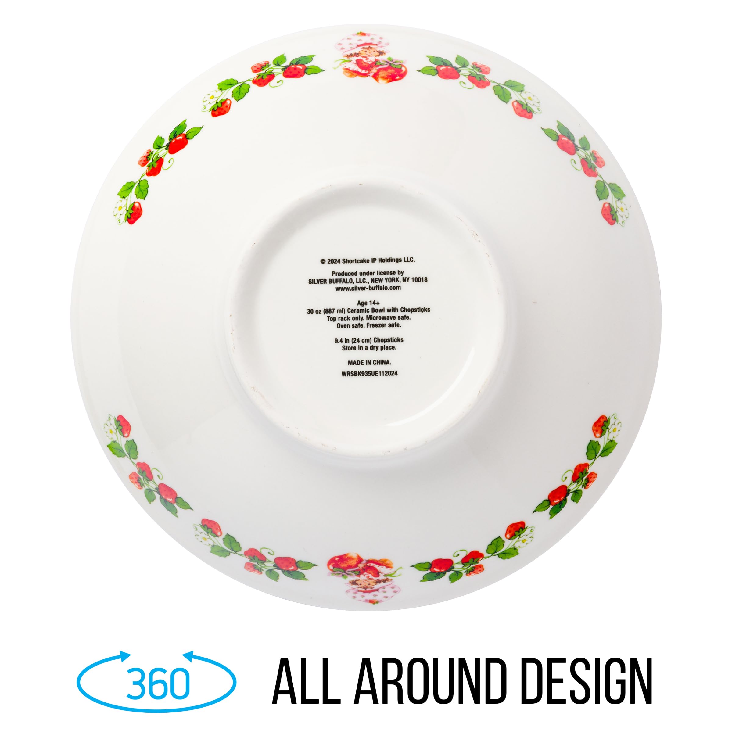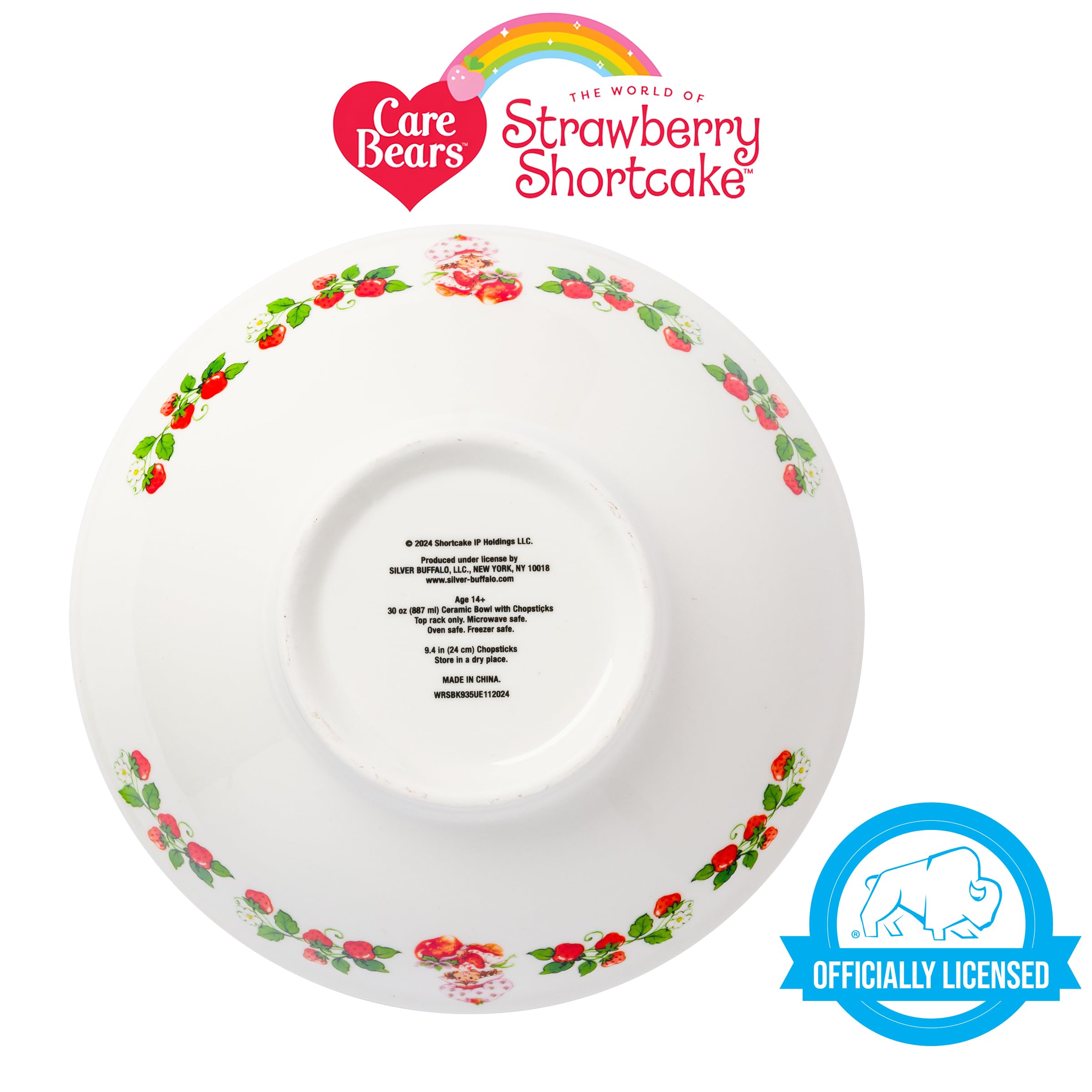 Enjoy your meals in this adorable bowl! Themed bowl features Strawberry Shortcake holding a strawberry. Surrounding the adorable character are strawberries, vines, and flowers. Bowl is white and the interior rim of the bowl has pink and white polka dots. Microwave safe. Bowl is TOP RACK dishwasher safe ONLY. Chopsticks are HAND WASH ONLY. This 30 ounce ceramic bowl comes with a pair of chopsticks to match the bowl. Enjoy your favorite meals in this themed dish! This themed ramen bowl set, with its nostalgic designs, makes a great gift for your favorite Strawberry Shortcake fan. Showcasing this beloved character, this item is perfect for birthdays, holidays, and other gift exchanges. Take a dive into the fictional world with Silver Buffalo! Silver Buffalo provides fans with official merchandise from their favorite characters. Working alongside licensors and brands, we create unique and imaginative products which are designed with great care and detail. Silver Buffalo aims to connect fans to their favorite cartoon characters, superheroes, movies, tv-series, and more. Celebrate your fandom!