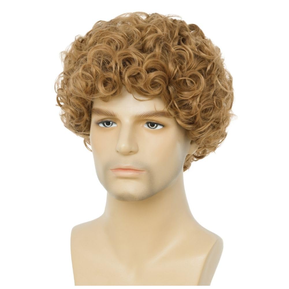About this wig: Top Quality Heat Resistant Synthetic Fiber Hair Style: Blonde Curly Wigs for Men. Make you look very cute and Charming, suitable for any occasion Texture: Natural Smooth Features: Touch soft, not easy tangled,looks natural. Q&A 1: Can I Curl or Cut the Wigs? Yes. You can be restyled it with the scissors or curling iron(below 150 Degrees Centigrade), but cannot be permed or dyed. Q&A 2:Can I Wash the Wigs? Yes. Just need a little mild shampoo and hair conditioner then washing in warm water. Then set on a flat towel and let them naturally dry. Warm Tips: 1.All synthetic hair wigs be happened to minimum shedding and tangling which is normal. 2.Color sometimes may be a little different From the photos because of your computer monitor's color setting or other reasons.