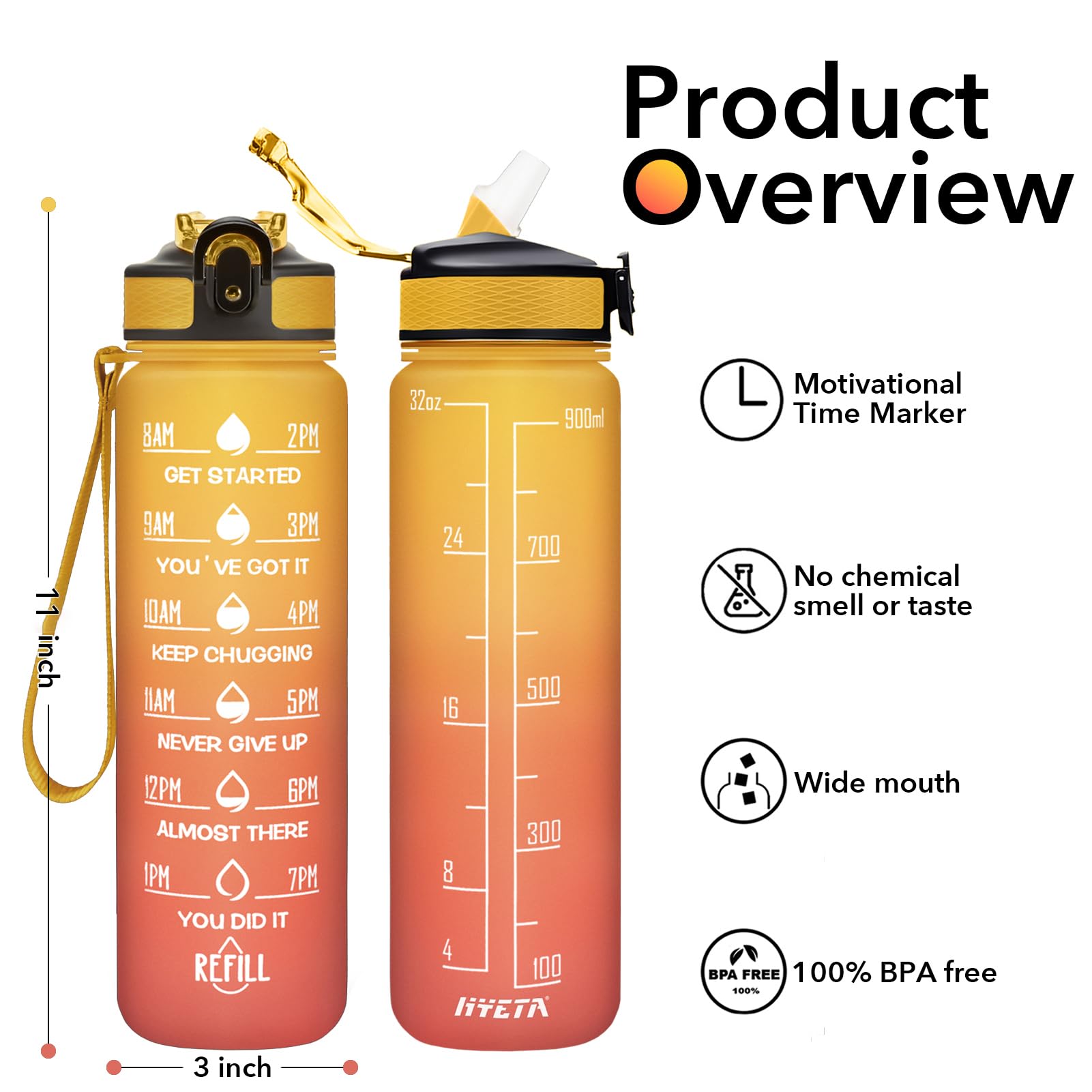 Motivational Quote and Time Marker: 32 oz water bottle with time markers and inspiring quotes, great for tracking daily water intake and staying hydrated.