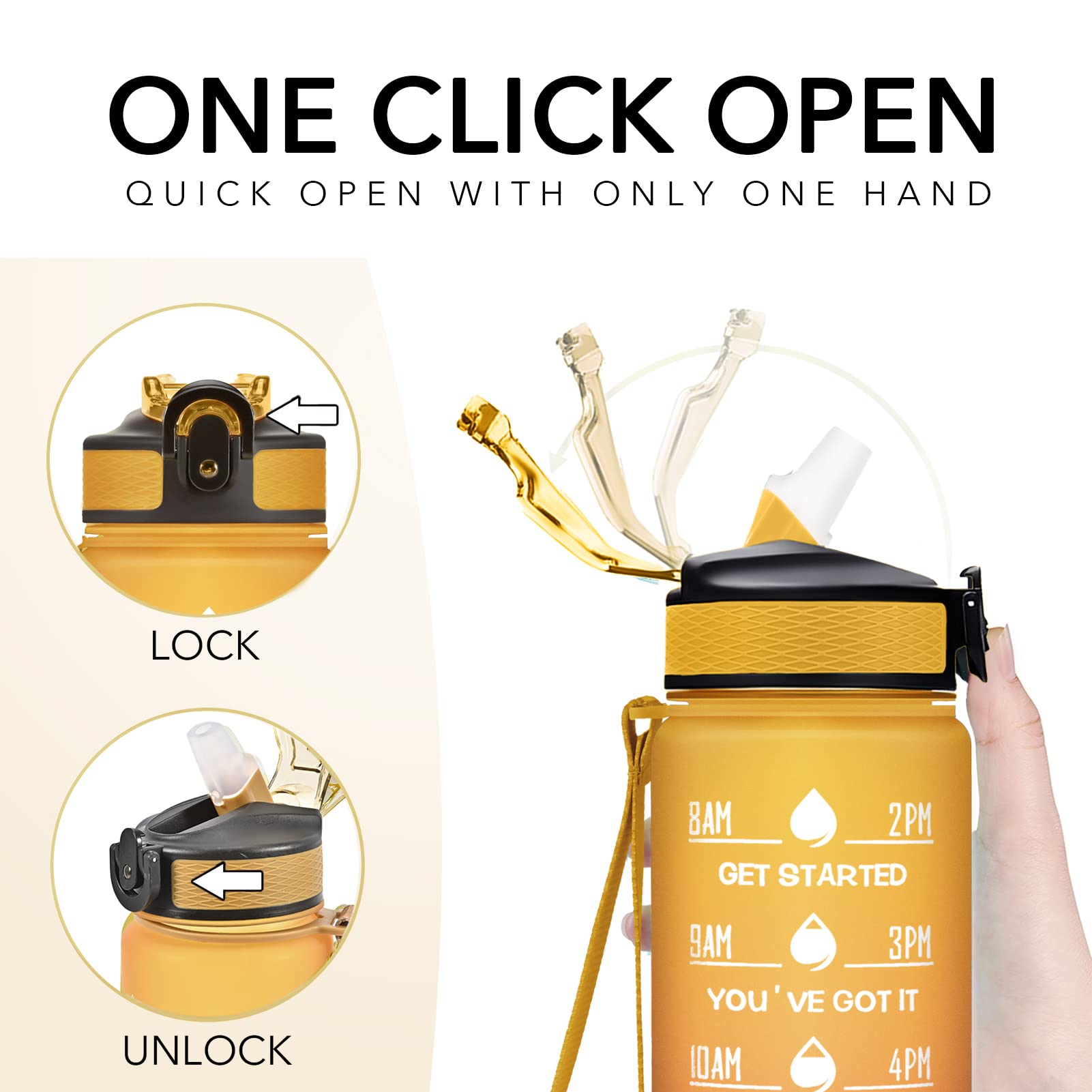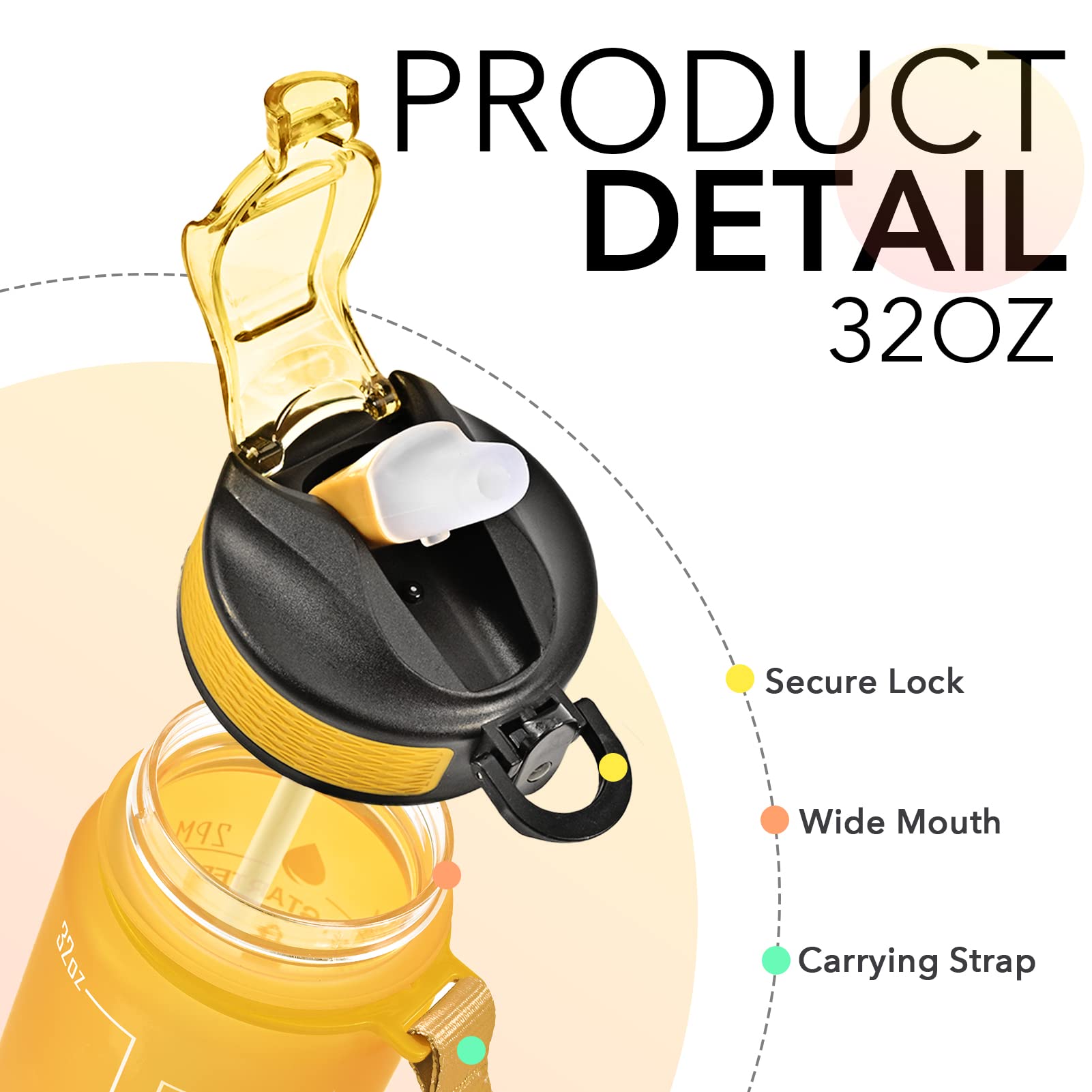 Functional Design: The bottle with straw allows for spill-proof sipping; The flip-top lid has a secure lock leak and can be opened easily with one hand; The wide mouth fits ice and is easy to clean.