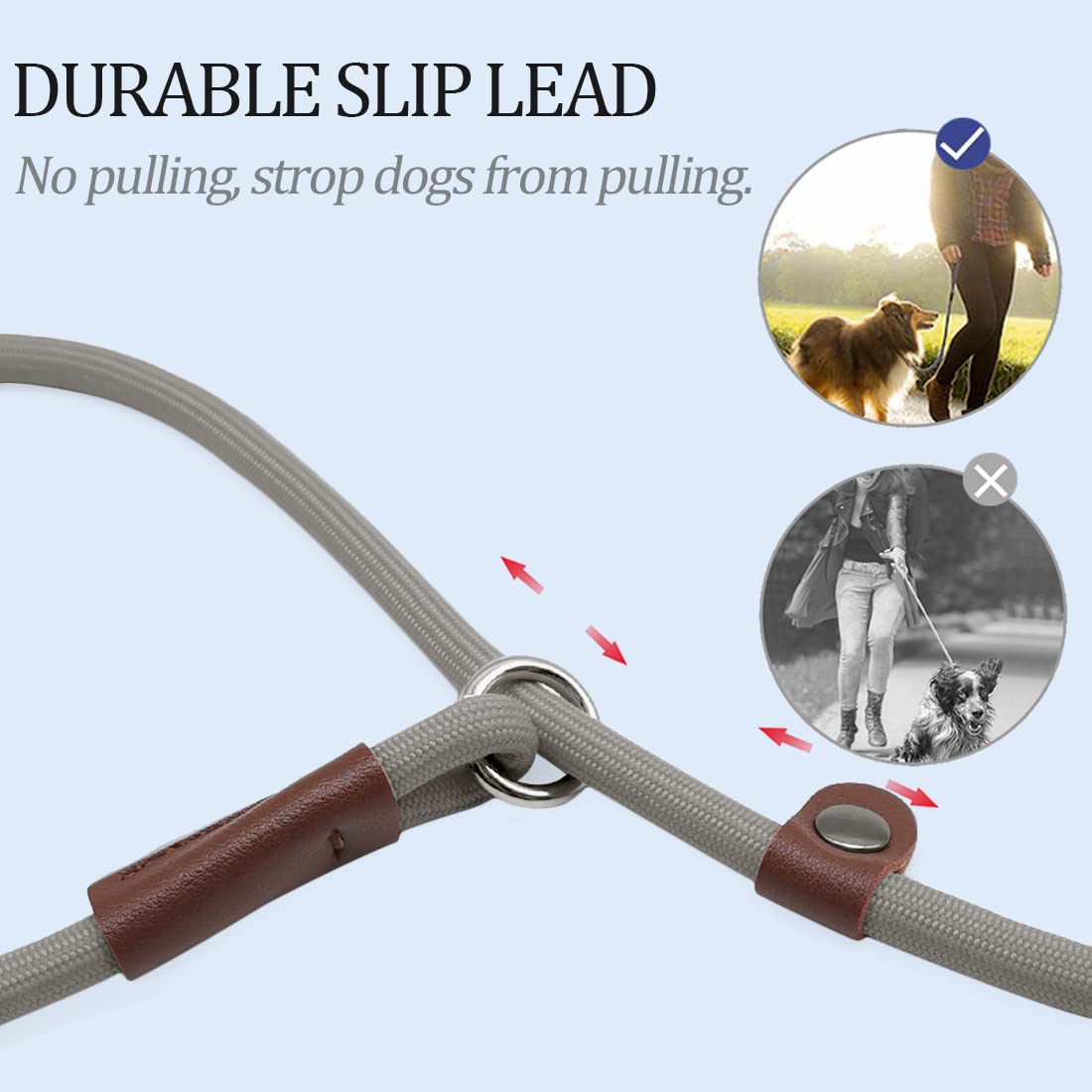 Easy to Use: No more fumbling with clasp! The slip lead design lets you simply loop around dog's neck and adjust the leather stopper to fit neck size. Great for rushed outings or active pups. Easy enough for kids and seniors to master instantly, making every walk stress-free fom the start