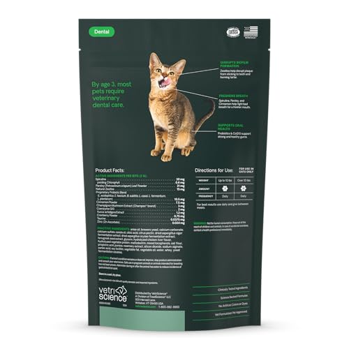 "Brushing a cat’s teeth isn’t easy so VetriScience made it simpler. Healthy Mouth Cat Dental Bites are crunchy-outside, soft-inside chews that help clean teeth, freshen breath, and support gum health with every bite. Each dual-layer chew is powered by a vet-formulated blend of zinc, natural zeolites, probiotics, and functional mushroom extracts that work together to balance oral bacteria and support a cleaner mouth. Consistent use helps reduce plaque and tartar buildup while keeping your cat’s breath fresher. Because cats deserve flavor, not fuss, each bite is packed with delicious chicken taste and only about 7 calories perfect for daily routines. Backed by NASC quality certification and trusted by veterinarians, Healthy Mouth Cat Dental Bites make oral care as easy as giving a treat. Use daily between professional cleanings to keep your cat’s smile bright, gums strong, and breath fresh."
