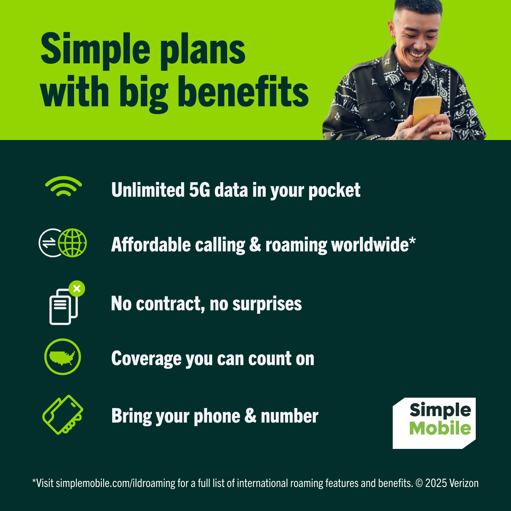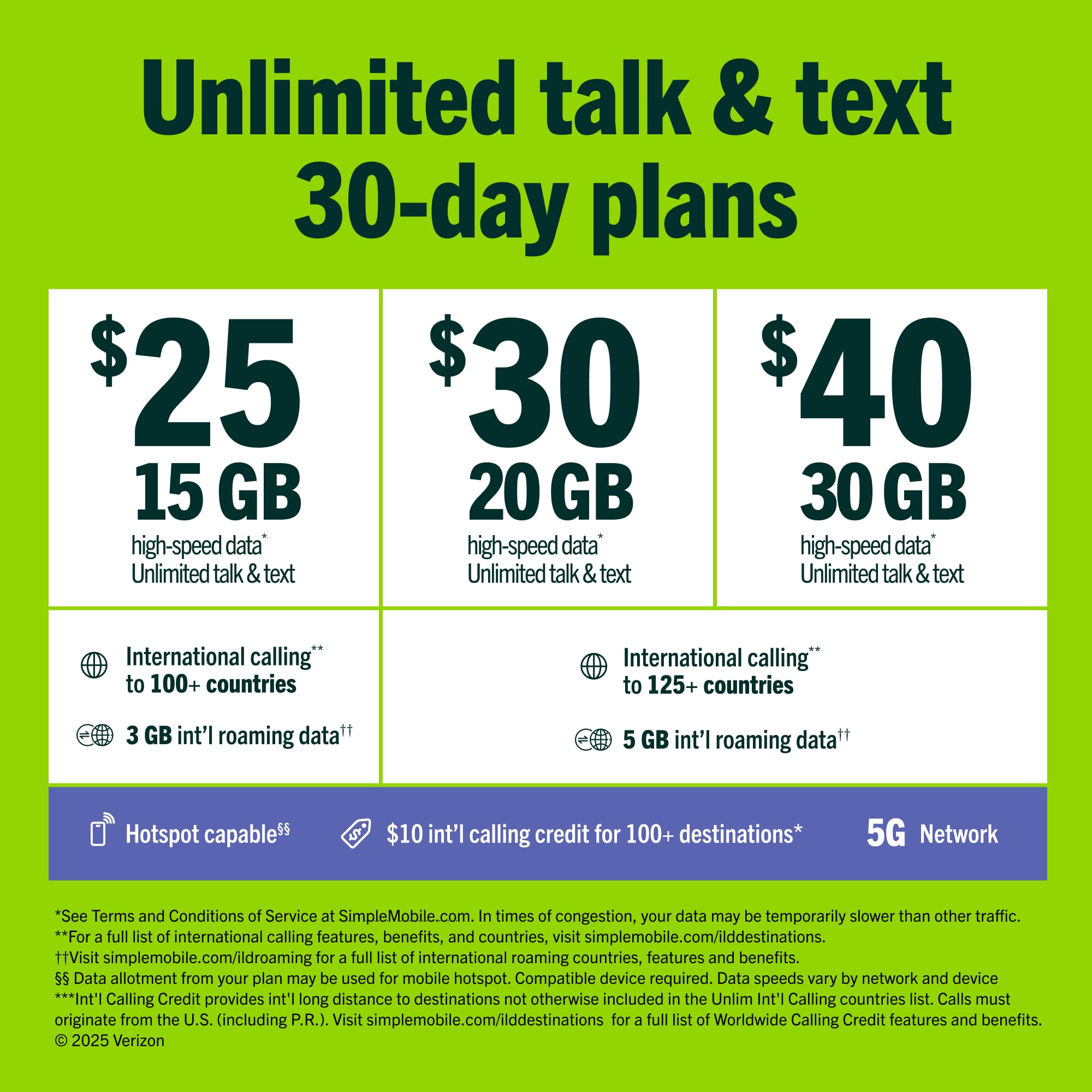 Compatible with Simple Mobile data and unlimited talk & text plans starting at $25/mo plus taxes and fees. To find the Simple Plans available to purchase, please go to our SM - Amazon Brand Page linked below the product title