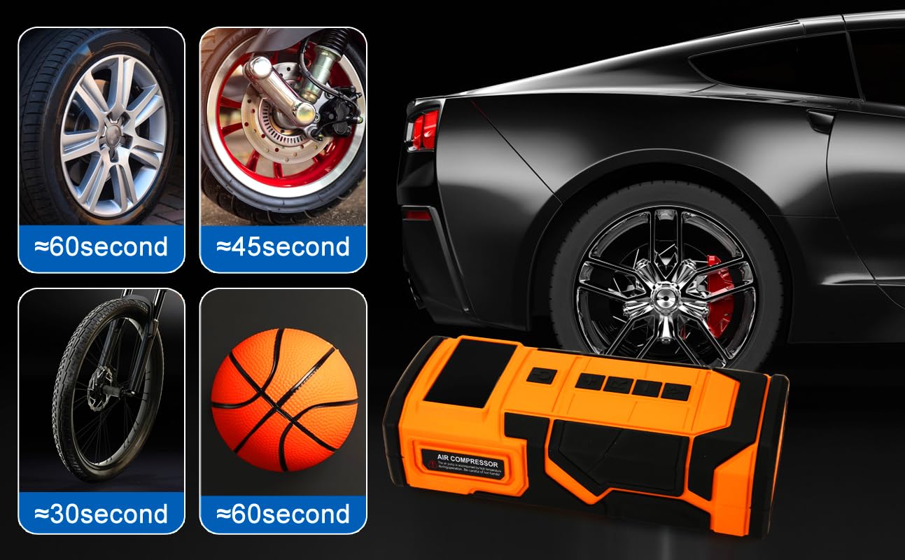 Tire Inflator Portable Air Compressor- This mini air compressor comes with led digital screen display, has preset tire pressure, one-touch inflation, fast inflation, full auto stop. It is suitable for cars, bikes, balls ect.