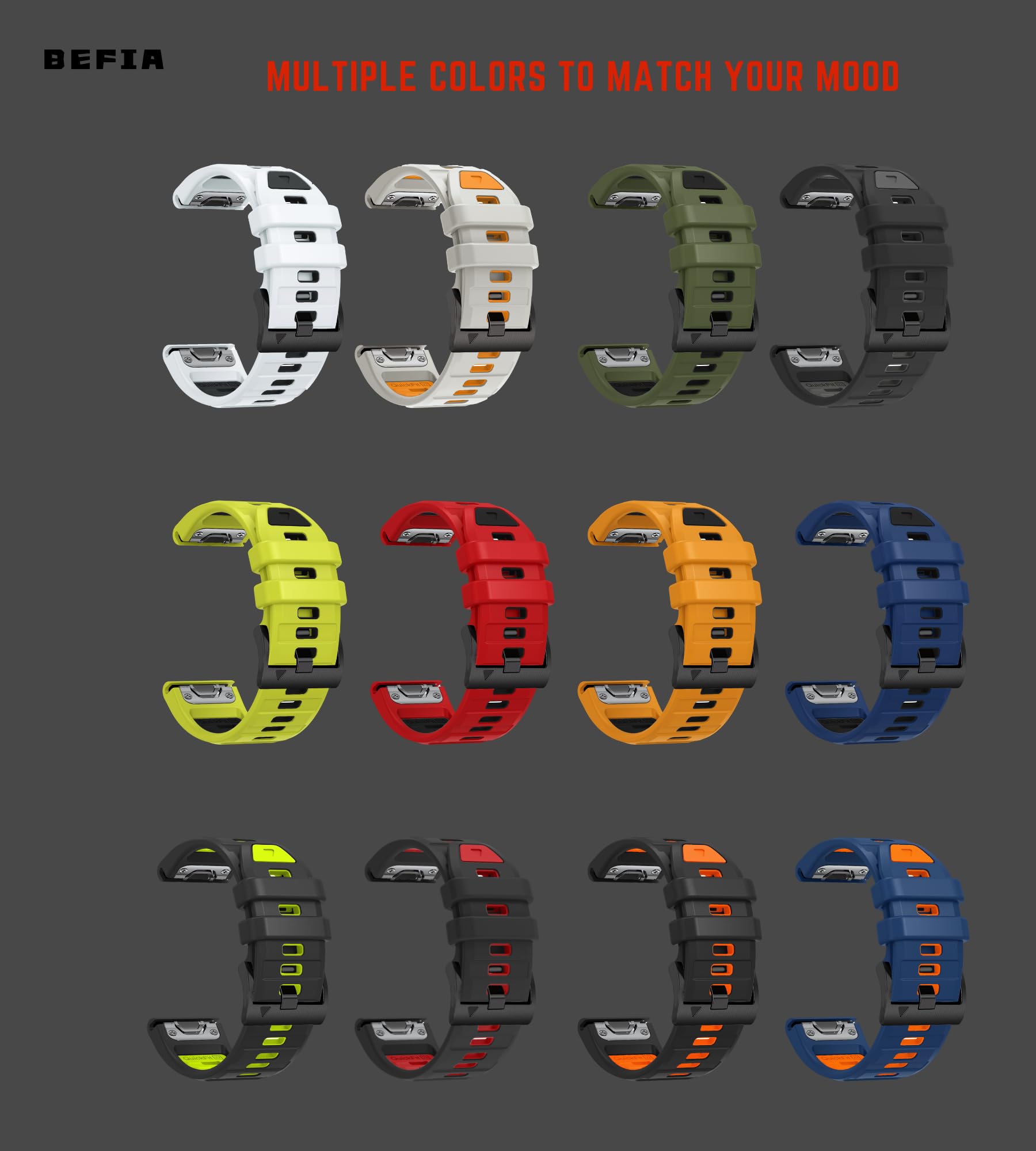 Muti Color Options: Choose from bright colors or classic white for a fresh, personalized look.Gym Beast: Neon Red Lime Green;Office Ready: Classic Black Midnight Grey;Weekend Explorer: Army Green Navy Blue;Sunset Vibes: Coral Orange.22 mm Quick fit design lets you switch styles for yoga class, business meetings, or date nights in seconds.Designed to complement any outfit, from sporty looks to casual wear.