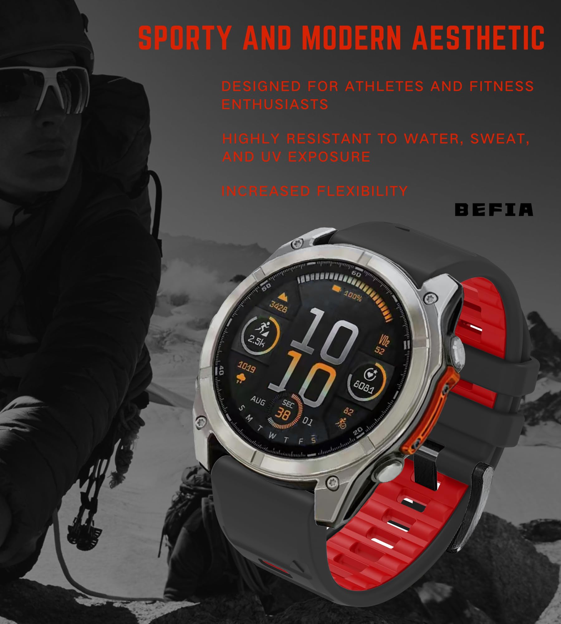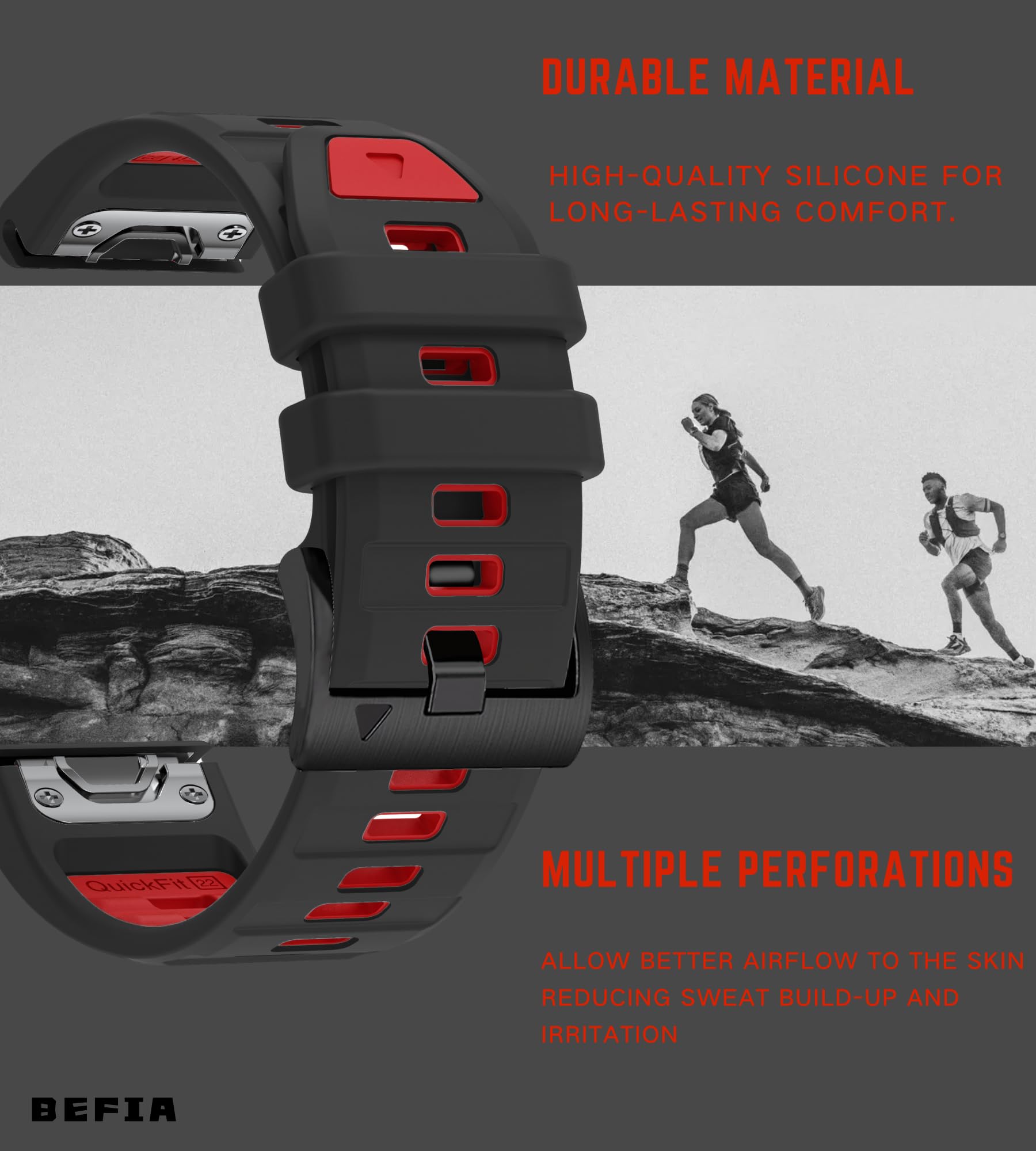 Description Never Lose Focus During Your Adventure Tired of watch bands that slip during critical moments? Our 22mm quickfit silicone strap locks securely through marathons, trail runs, open-water swims, triathlons, kayaking, and rock climbing. No more stopping to adjust mid-race! Breathe Easy in Water & Sweat Specially designed ventilation channels keep your skin dry during lap swimming, surfing, paddleboarding, or HIIT workouts. Say goodbye to skin irritation caused by trapped moisture. Your Style, Your Day Match your active lifestyle with 10 vibrant colors: - Gym Beast: Neon Red/Lime Green - Office Ready: Classic Black/Midnight Grey - Weekend Explorer: Army Green/Navy Blue - Sunset Vibes: Coral Orange/Burgundy Quick change design lets you switch styles for yoga class, business meetings, or date nights in seconds. Rubber Band Replacement Engineered for Garmin Fenix 8 47 mm 7 6 Warriors Precisely crafted for 22mm QuickFit connectors on: 22mm watch band compatible with Garmin Fenix 8 47mm | Fenix 7 Pro/Sapphire | Fenix 6/6 Pro | Forerunner 955/965 *Not compatible with Fenix 7X/6X/5X or Epix 51mm models Why Athletes Choose This Band Saltwater-proof performance for ocean swimmers Non-slip grip during muddy trail runs Zero residue after sweaty cycling sessions Quick dry material for multi-day hikes Technical Details Material: Perforated medical silicone Buckle: Reinforced Metal Pin Buckle Band width: 22mm Quick Fit standard Weight: 1.06oz - Lighter than original bands