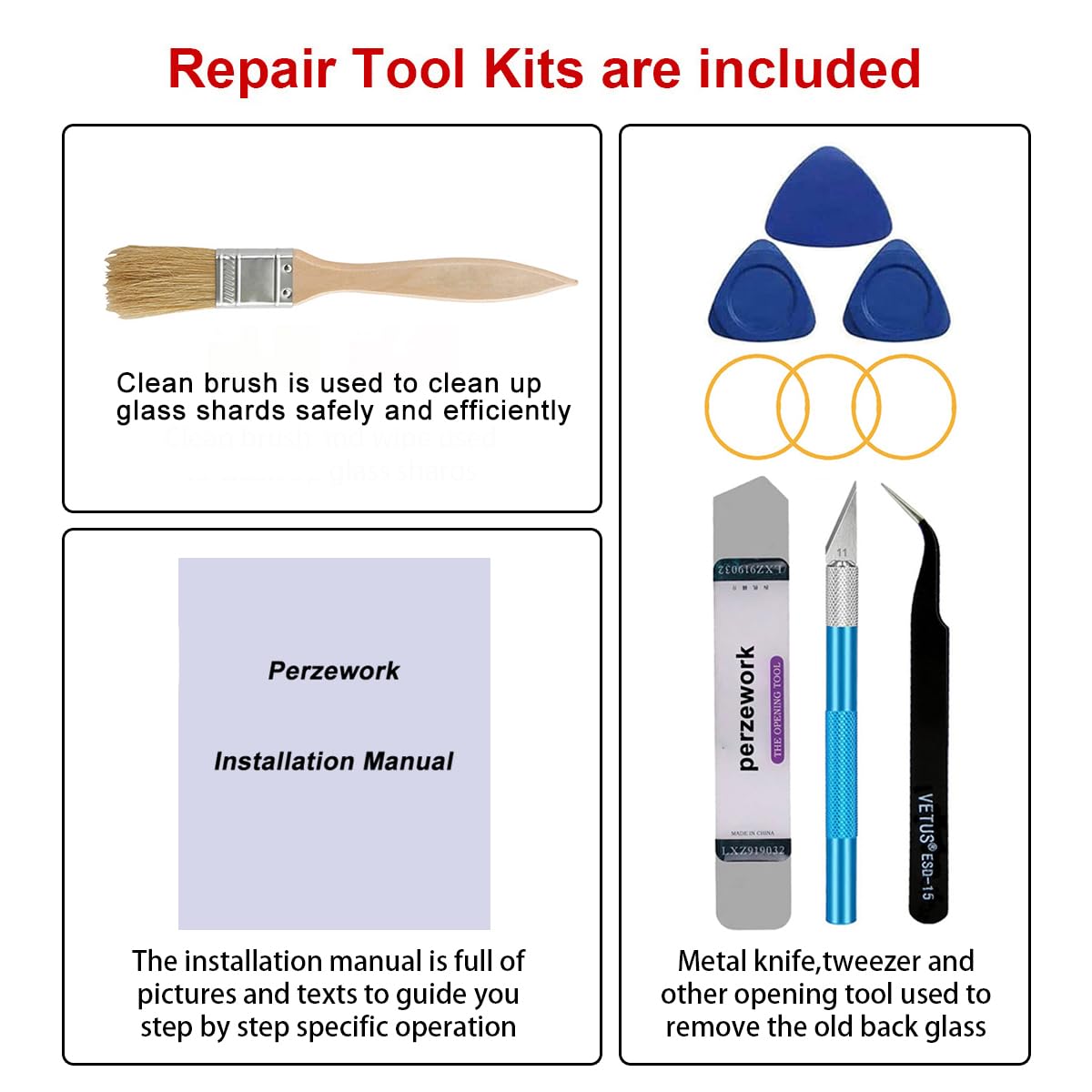 【Comes with Full Set Toolkit】It comes with a full set professional repair toolkit. It is much easier for you to remove the broken back glass.Please note that you need to prepare a heat gun or a hair dryer,becasuse the original adhesive is very strong.