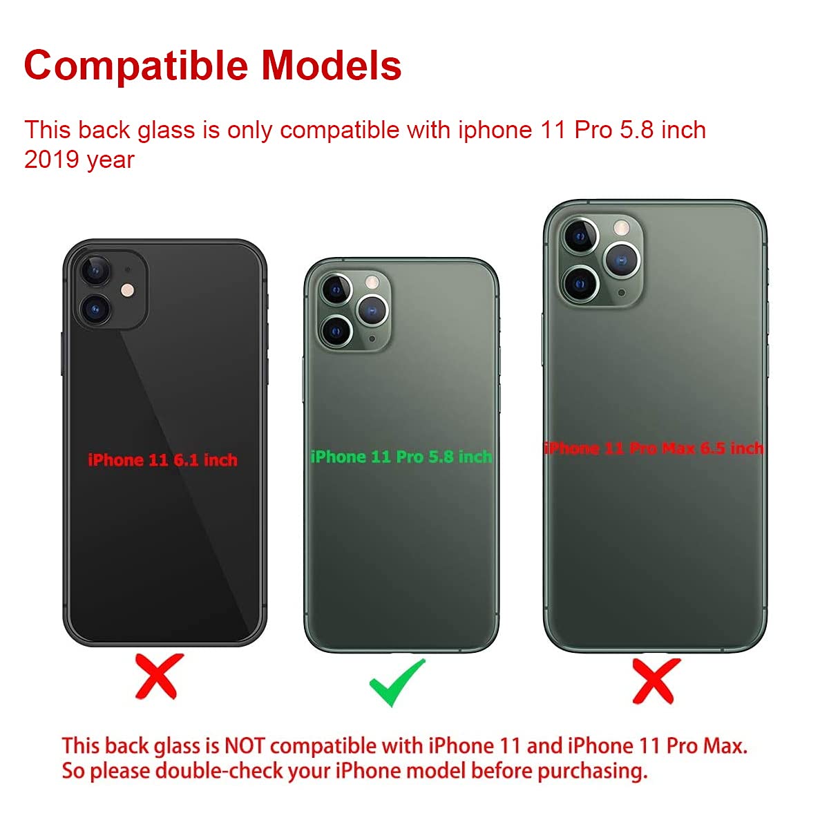 Product Features: 1.Compatible with iPhone 11 Pro 5.8 inches. (All Carriers). 2.Brand new and OEM quality.100% perfectly fit. 3. This replacement back glass will repair your cracked, damaged, scratched iPhone 11 Pro. Restore the device back to new. Warm Tips: 1. We provide 12 months warranty for the back glass replacement. Feel free to contact us if you are not 100% satisfied with it. 2. Installation manual is included and it contains specific operation steps for your reference to DIY. 3. Please power off your phone before replacement. 4. You need to prepare a hair dryer or a heat gun to heat and soft the old glue of broken back glass. Package included: Back Glass Replacement for iPhone 11 Pro with the the adhesive sticker pre-installed×1 Standard Replacement Toolkit×1 Toolkit Includes: Metal Flat End Knife×1 Metal Sharp Knife×1 Metal ESD Tweezers×1 Opening Pry Card×1 Metal Triangle Pick×2 Installation Manual×1 Clean Brush×1