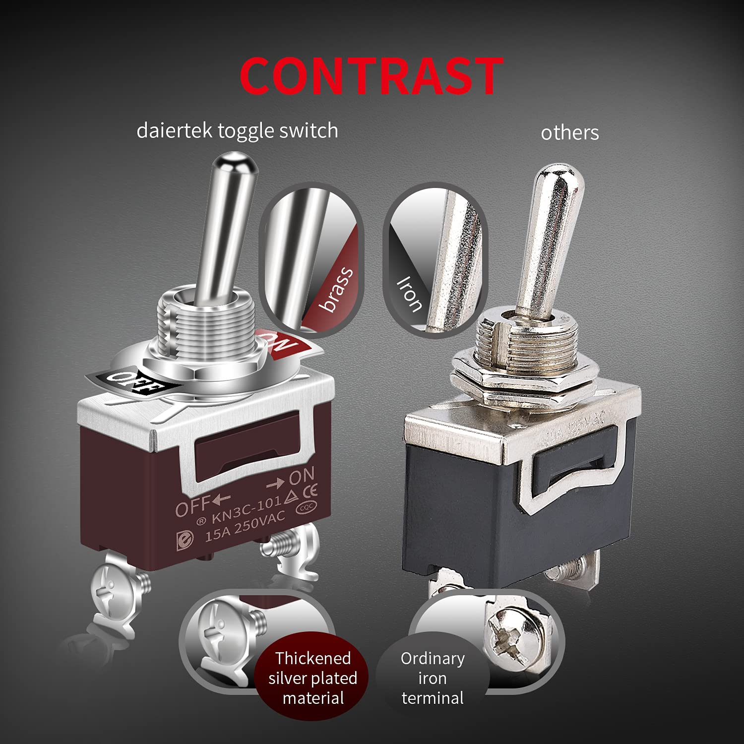 Function: Waterproof toggle switch with 2 pin SPST design (single pole single throw), easy to turn ON OFF. The rating of this heavy duty toggle switch is 30A 12VDC; 15A 250VAC; 20A 125VAC.