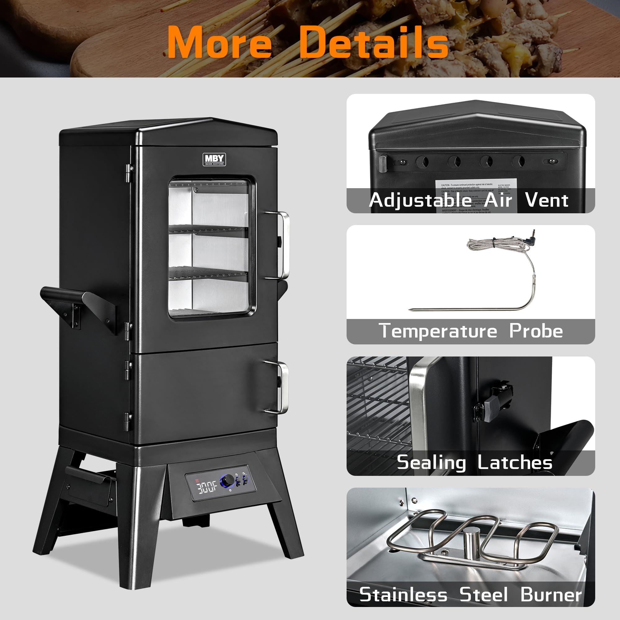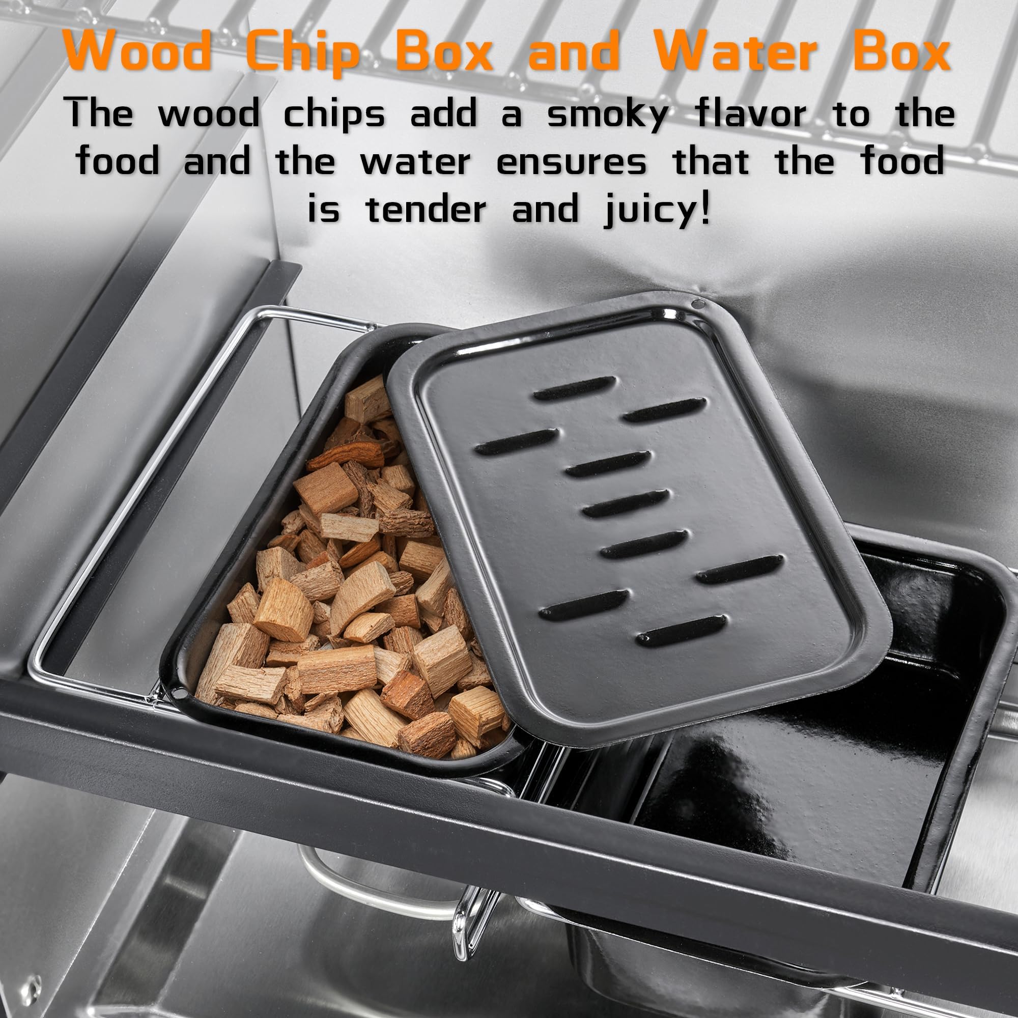 【Precision Electric Smoker with Meat Probe & Digital Control】 Take the guesswork out of smoking! The built-in meat probe (50°F-250°F) and digital thermostat (100°F-400°F) let you monitor internal temps in real time. Achieve perfect juicy brisket (203°F), tender pulled pork (195°F), flaky salmon (145°F), and fall-off-the-bone ribs (190°F)—all without opening the door!