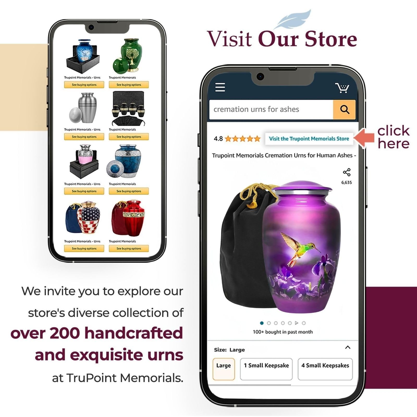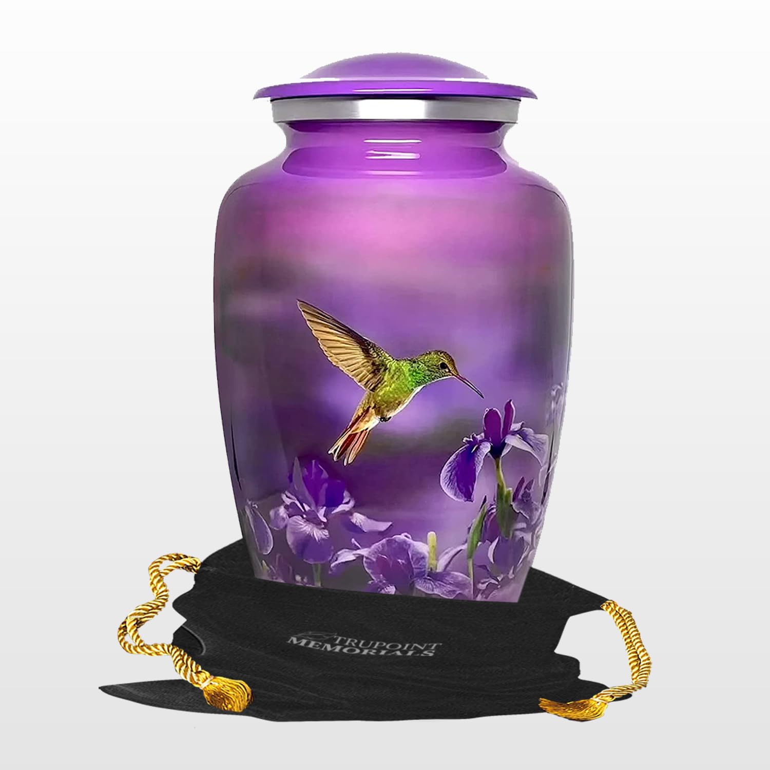 Handcrafted HummingBird Urn for Ashes: Handcrafted using top-grade Aluminum, this burial urn for ashes comes in an elegant beautiful Purple with HummingBird finish with a protective coating designed to last the years.