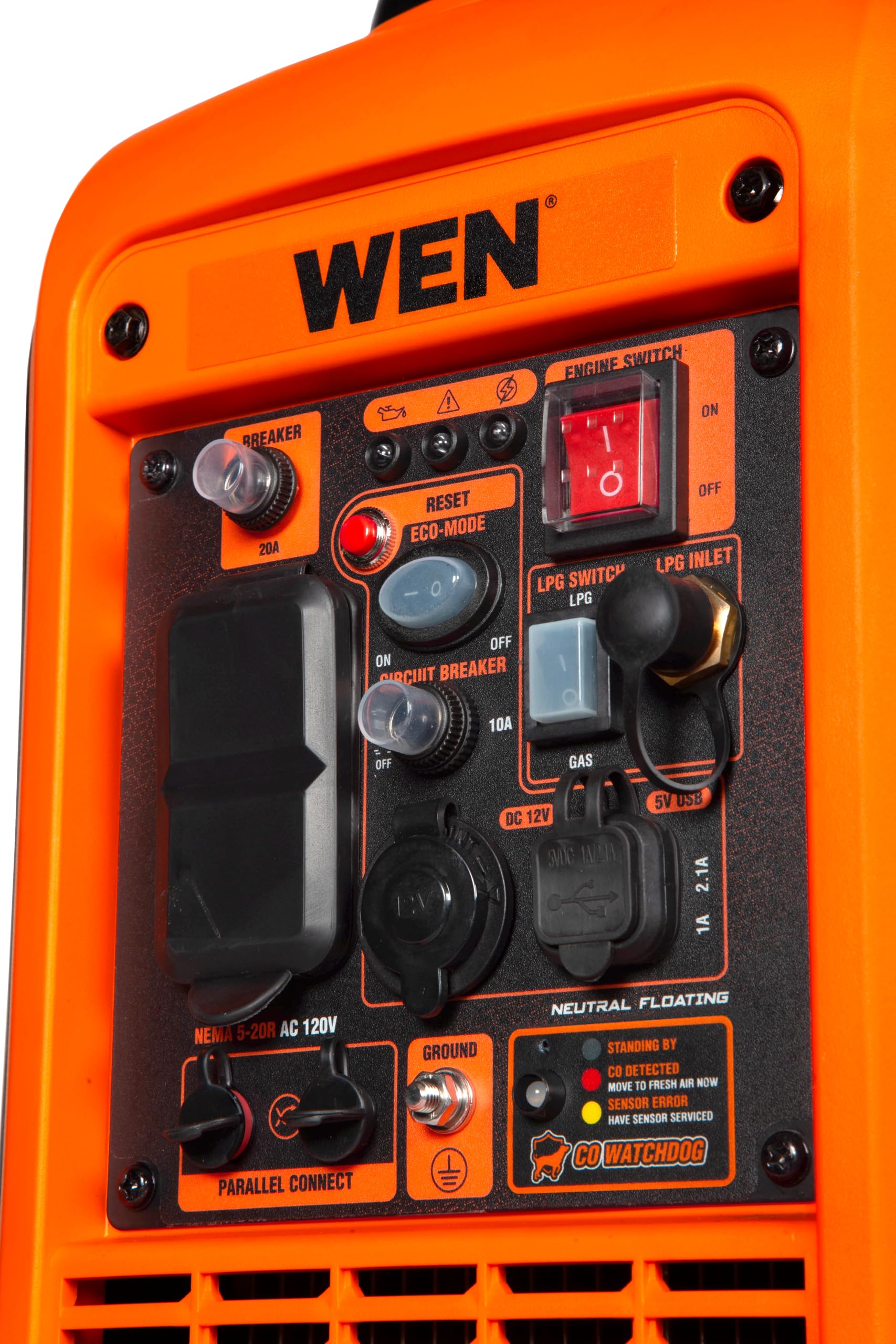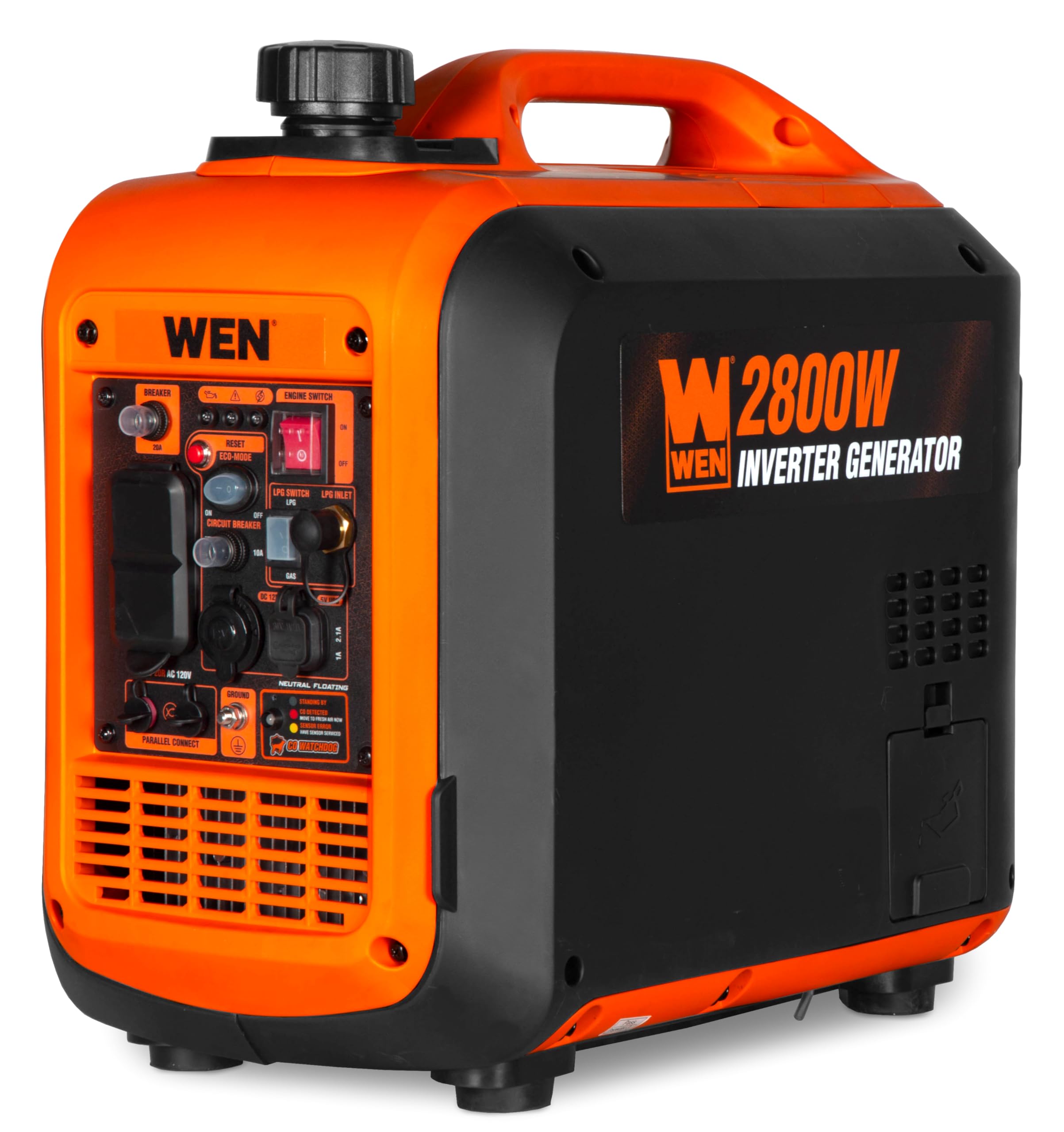 Remember when you had clean and quiet portable power? The WEN 2800-Watt Inverter Generator provides clean energy, free of voltage spikes and drops, without all the noise of a regular generator. Produce up to 2800 surge watts and 2250 rated watts of power on gasoline, or connect a propane tank for up to 2800 surge watts and 2000 rated watts of power on LPG. The WEN Watchdog CO Shutdown Sensor helps protect both you and your family by automatically turning off the generator if dangerous levels of carbon monoxide are detected. Our 98cc engine operates at a quiet 60 decibels at no load. This limits its invasiveness while camping, hunting, tailgating, and restoring backup power. The WEN 2800W Inverter Generator is also equipped with fuel shutoff. This feature turns off the flow of fuel, allowing for the generator to use up the remaining fuel from the carburetor before automatically shutting down. This helps fight the build-up and blockages caused by stagnant fuel inside of the carburetor, minimizing maintenance while prolonging the unit’s lifespan. Designed to mirror a pure sine wave, this generator limits total harmonic distortion to under 0.3 percent at no load and under 1.2 percent at full load, making it safe to run laptops, cellphones, monitors, tablets and other sensitive electronics. The lightweight 45-pound design makes for easy portability while the ultra-efficient 1.58-gallon tank provides up to 9 hours of half-load run time (or 13.9 hours half-load run time on a 20-pound LPG tank). The fully-packed panel comes equipped with two three-prong 120V NEMA 5-20R receptacles, one 12V DC receptacle, and two 5V USB ports. Maximize fuel economy by engaging the eco-mode switch. This allows the generator's engine to automatically adjust its fuel consumption as items are plugged into and unplugged from the panel, preventing the unnecessary usage of fuel. Need more energy? Easily link up any two WEN inverter generators using a WEN Parallel Connection Kit (sold separately) in order to share wattage amongst multiple units. Low-oil and low-fuel automatic shutdown combine with the built-in overload protection and indicator lights to safeguard both your generator and your electronics from damage. And because this is a WEN Product, your inverter generator comes backed by a 3-year limited warranty, a nationwide network of skilled service technicians and a friendly customer helpline. Remember when your generator powered your electronics safely and quietly? Remember WEN.